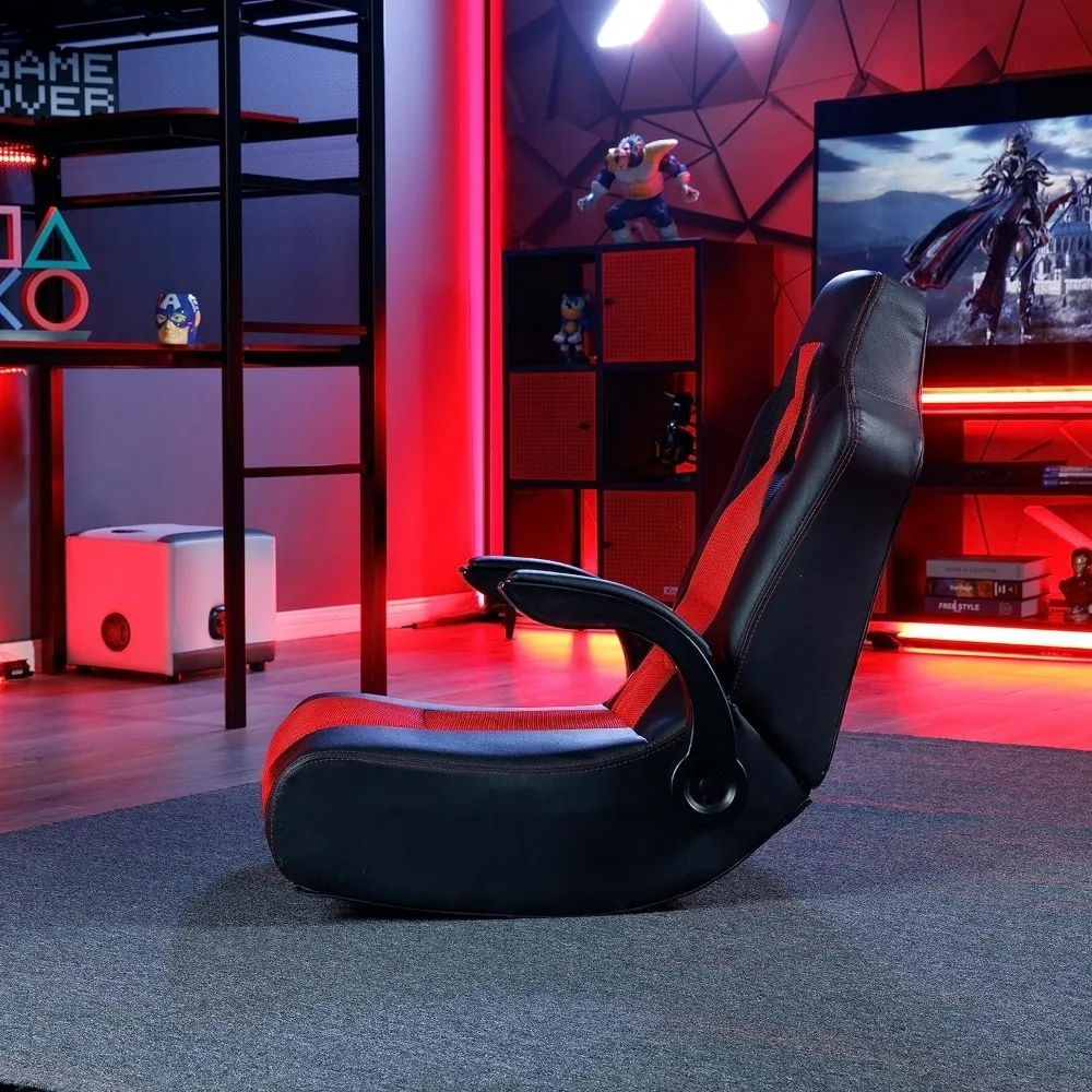 - Sleek Floor Gaming Chair: gaming chair with Bluetooth 2.1 audio speakers and a sleek red and black design; easy assembly with included Allen wrench