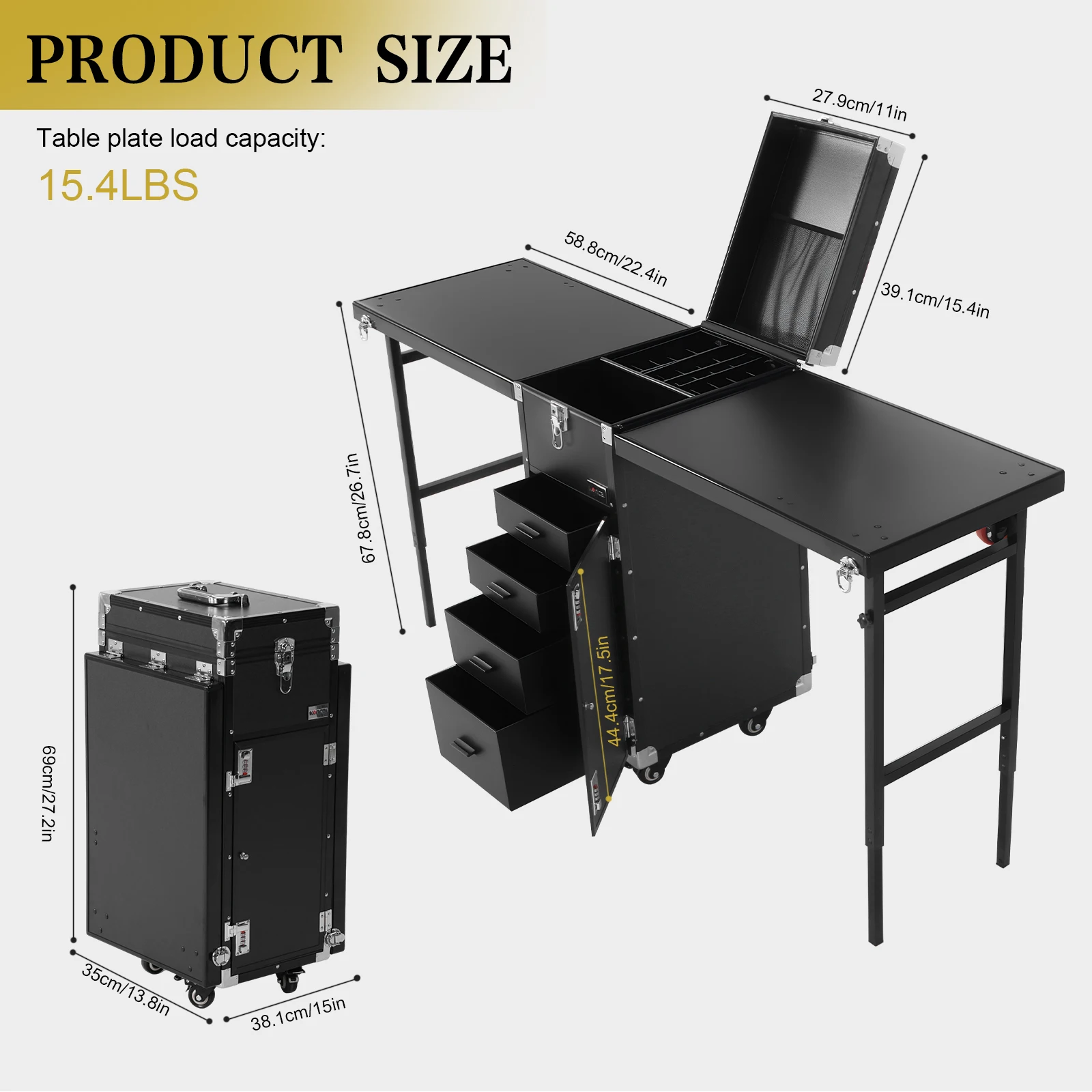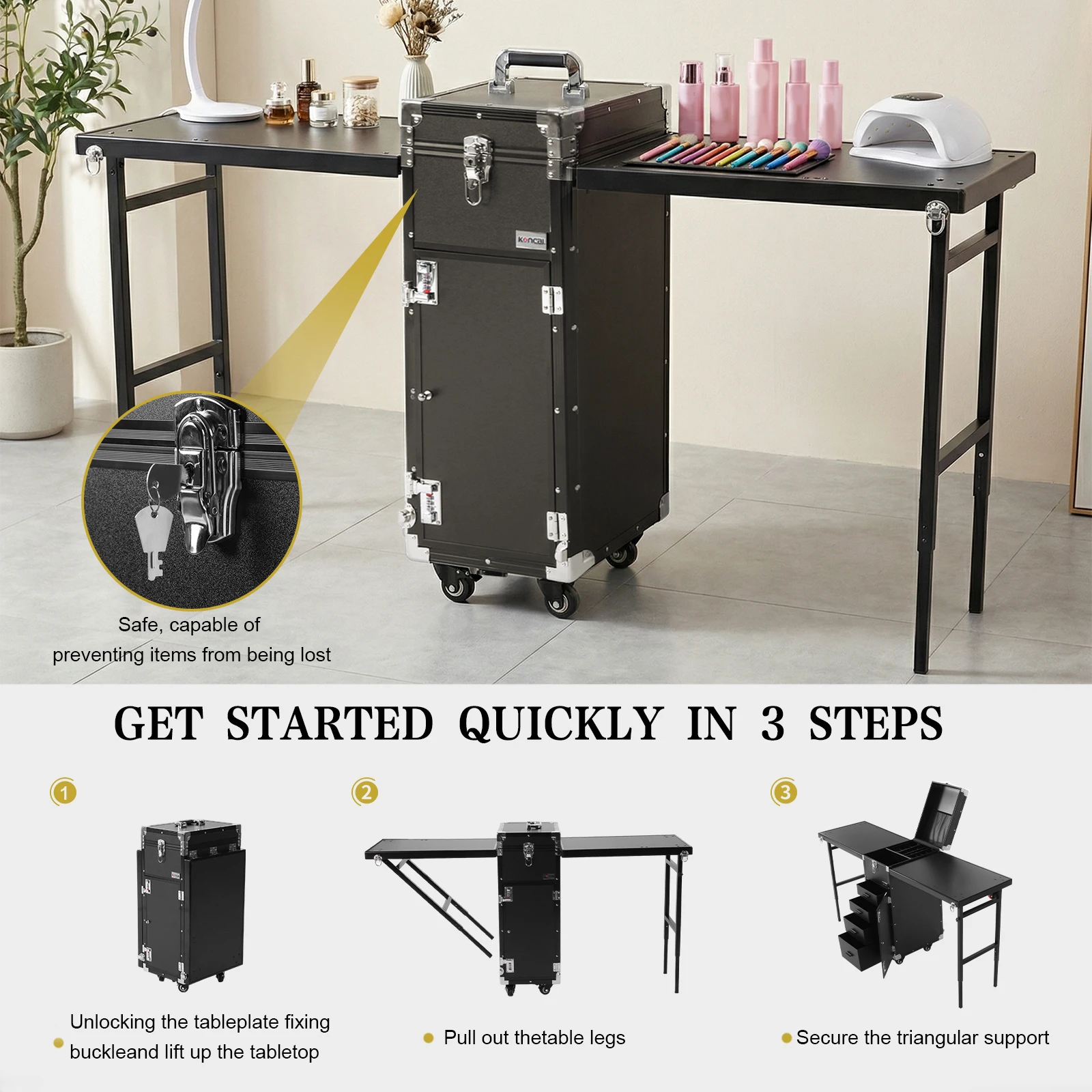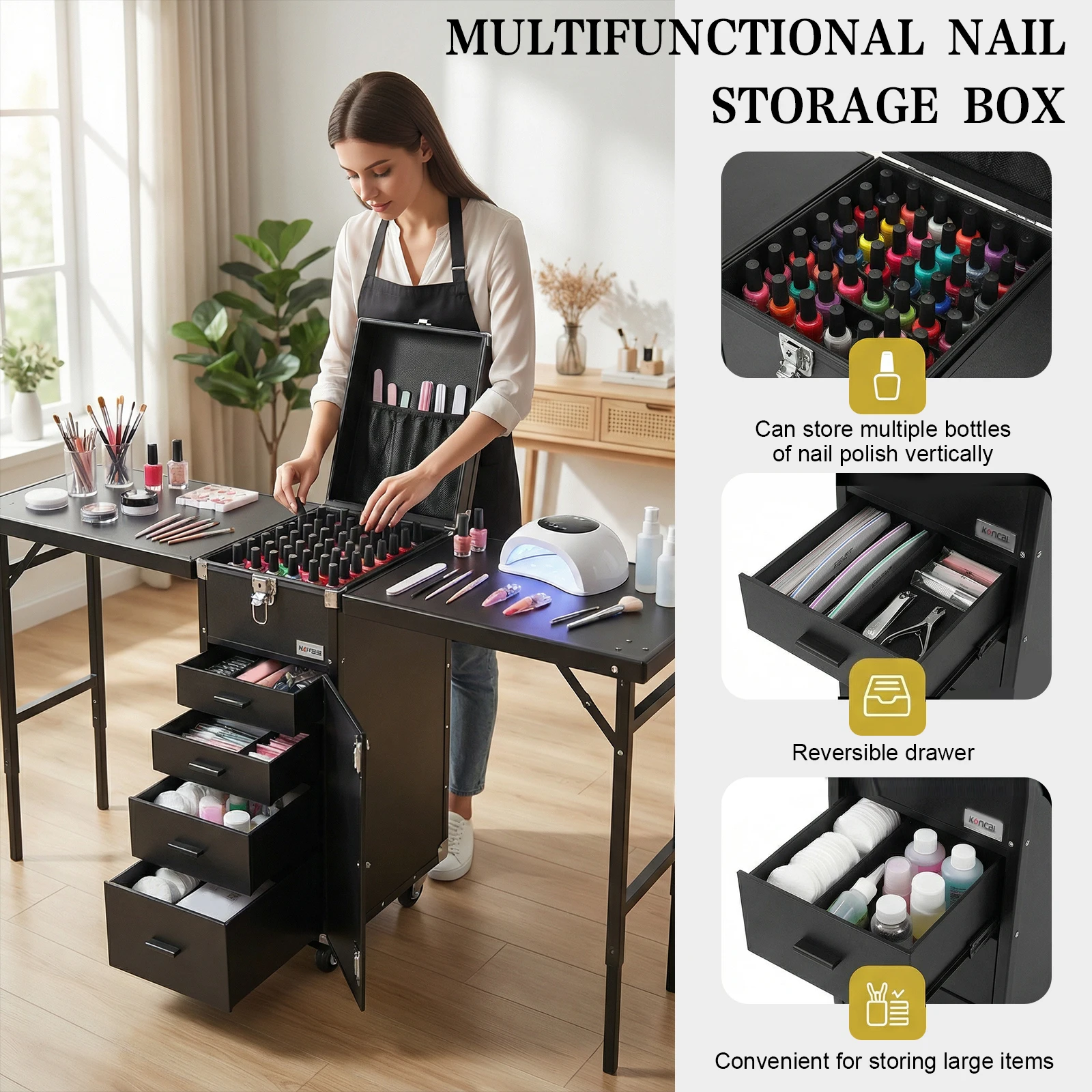 Portable Nail Table Desk with Wheel & Drawers Foldable Rolling Manicure Table Large Capacity Lockable Makeup Train Case for Nails Tech & Salon