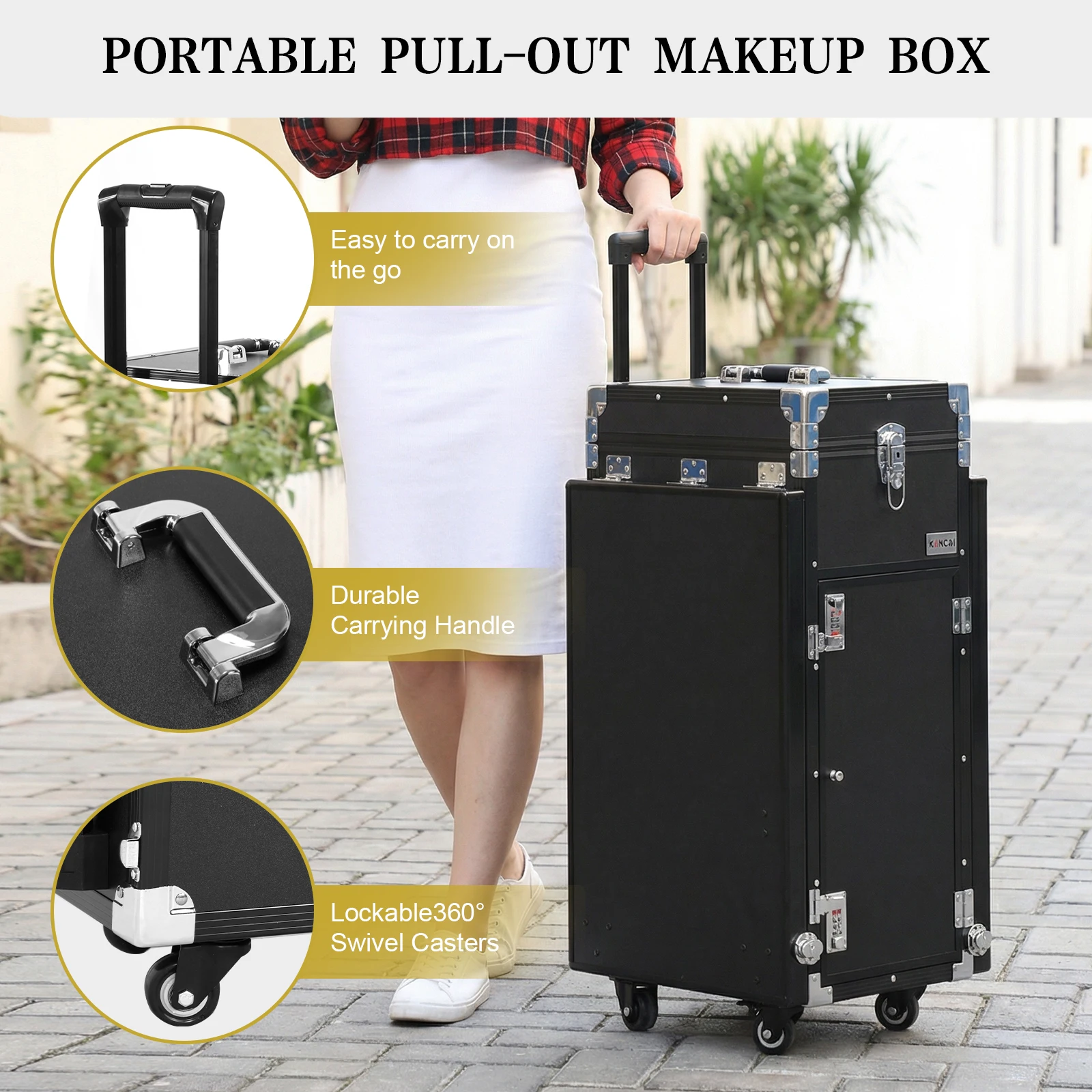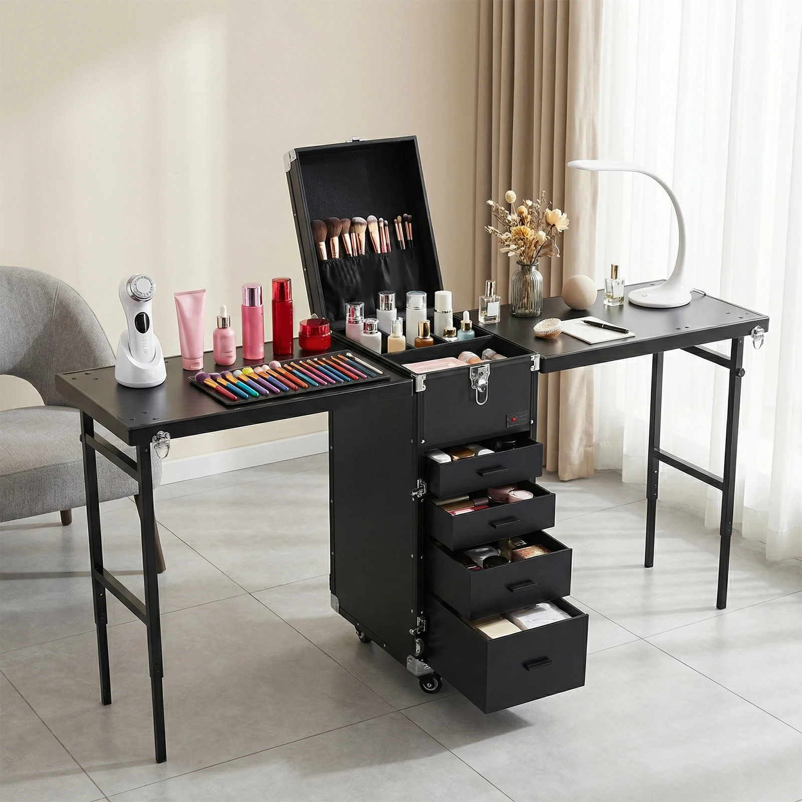 3.Smart Storage Solutions: Profit from additional elastic bands and mesh pockets beneath the foldable desk for efficient organization. The lockable makeup train case features high-quality 360° swivel wheels that are both smooth and silent, with all four wheels lockable for stability during use.