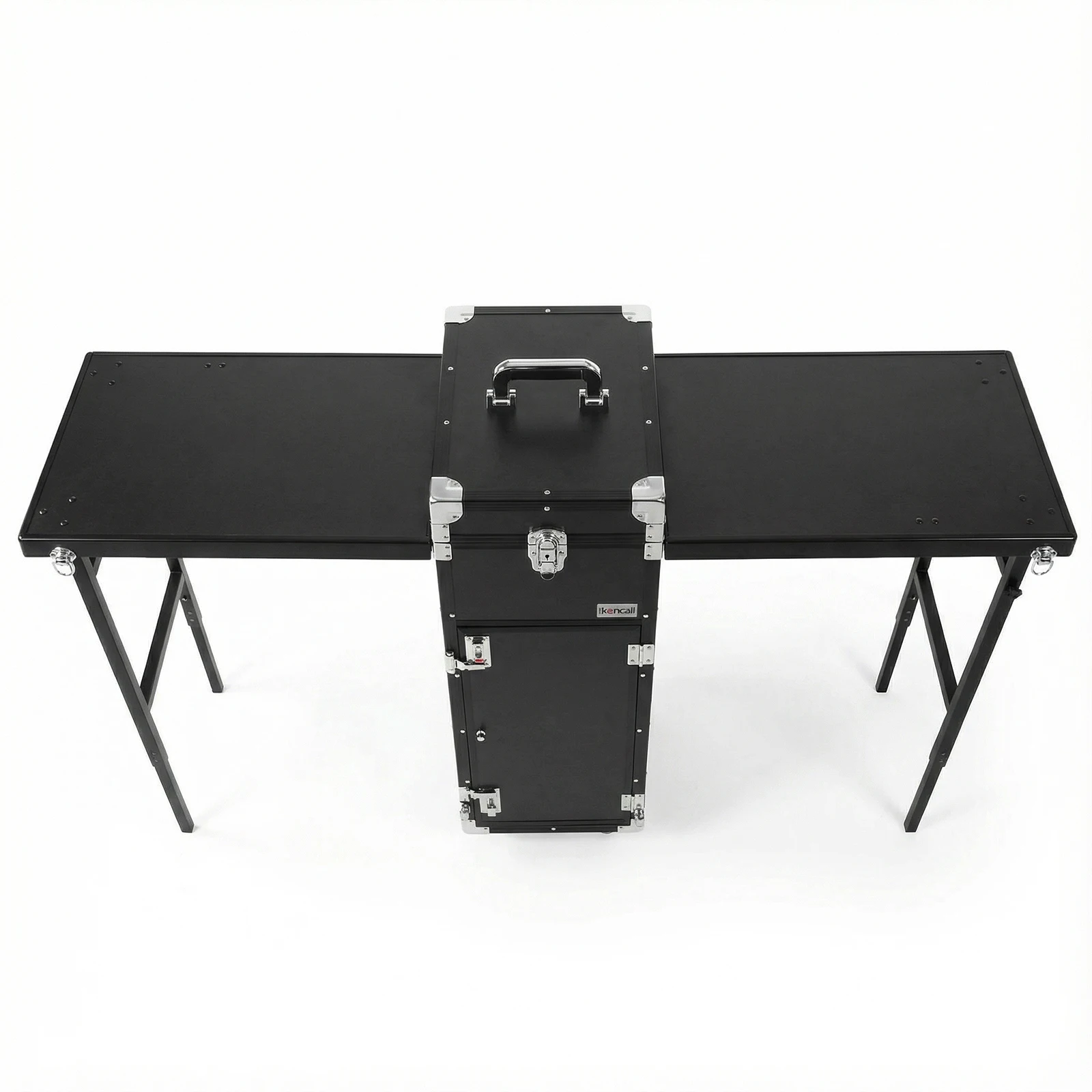 1.Solid Construction & Secure Storage: This portable nail table desk is built with a sturdy aluminum alloy frame and reinforced metal corners, ensuring long-lasting use and superior impact protection. The lid includes a keyed lock to safeguard your valuable cosmetics during travel or storage.