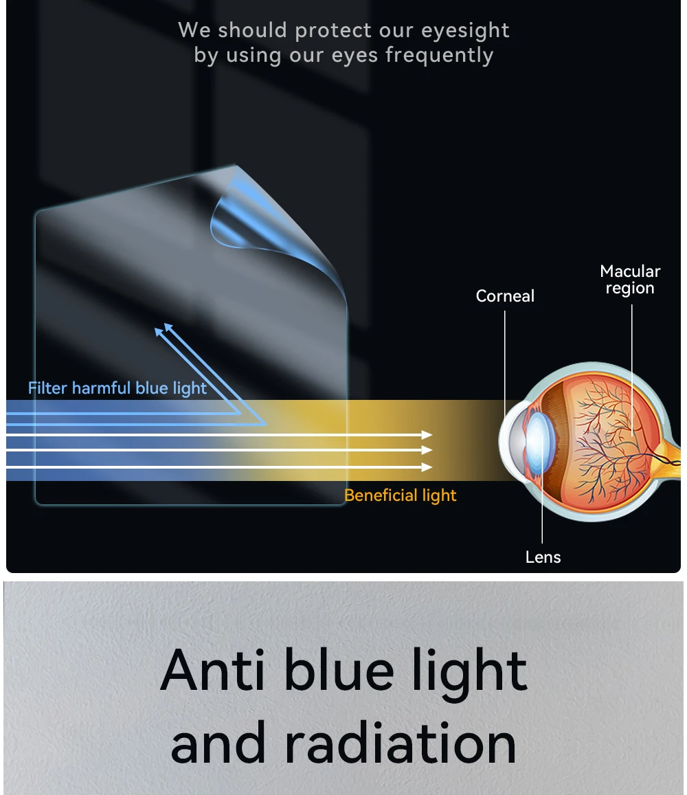 The anti blue light filter is not very well appreciated in the photos, but in reality it is. Comes very well packaged and protected with cardboard. Very well. Comes flat, which is important, not like others that it comes rolled up. I recommend it!