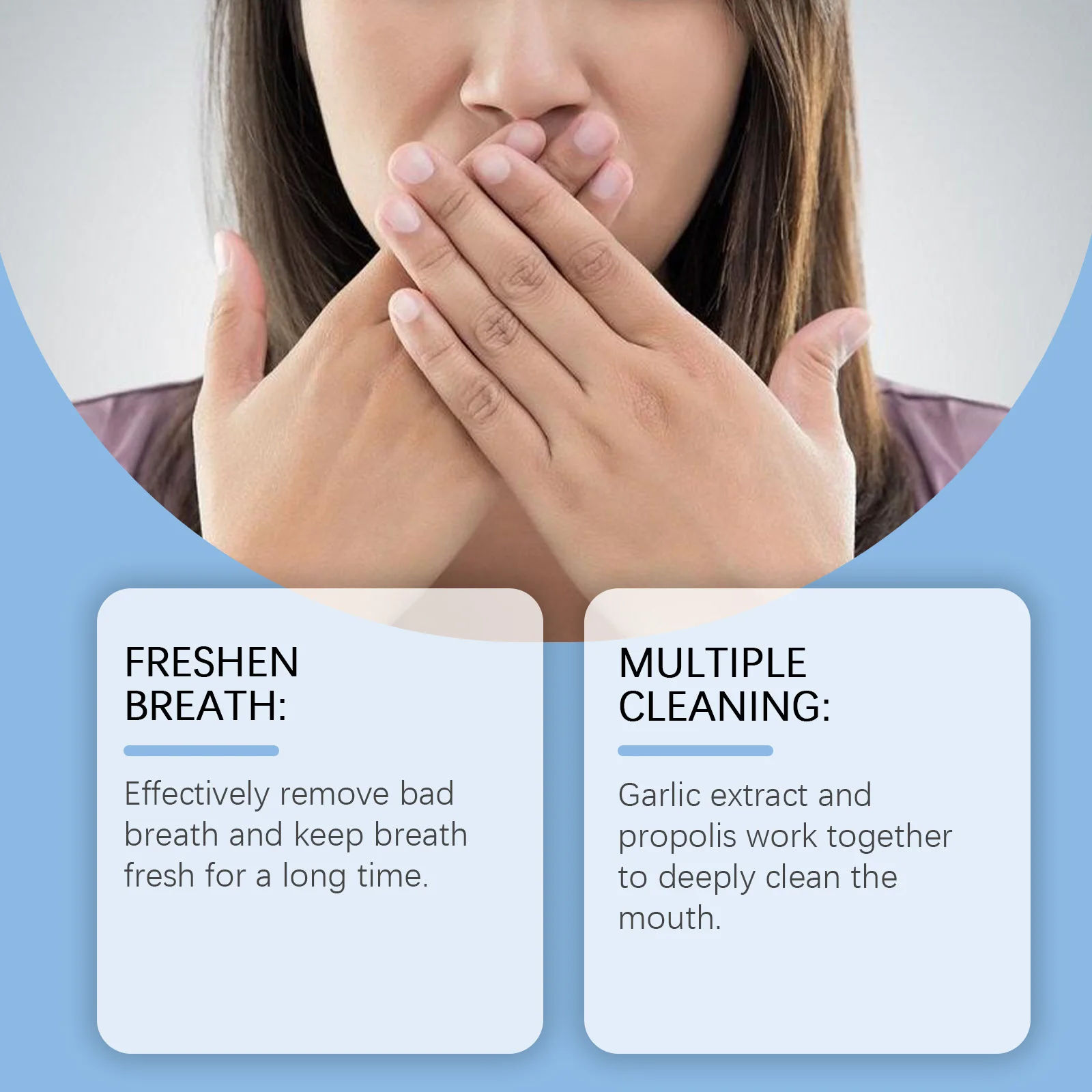 1. Our dental care mouthwash contains garlic extract, chamomile extract, and peppermint extract. Garlic extract and propolis work together to deeply cleanse your mouth, effectively eliminating bad breath and leaving it fresh for long-lasting breath.