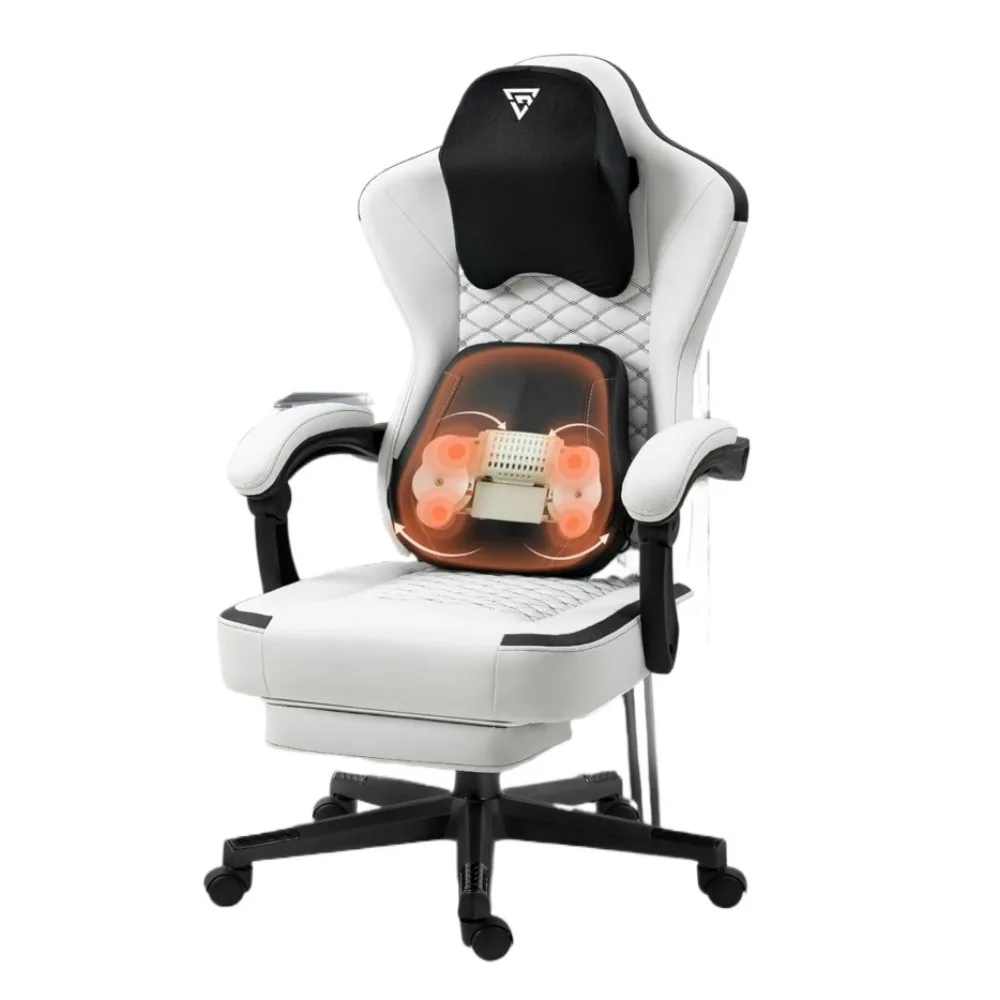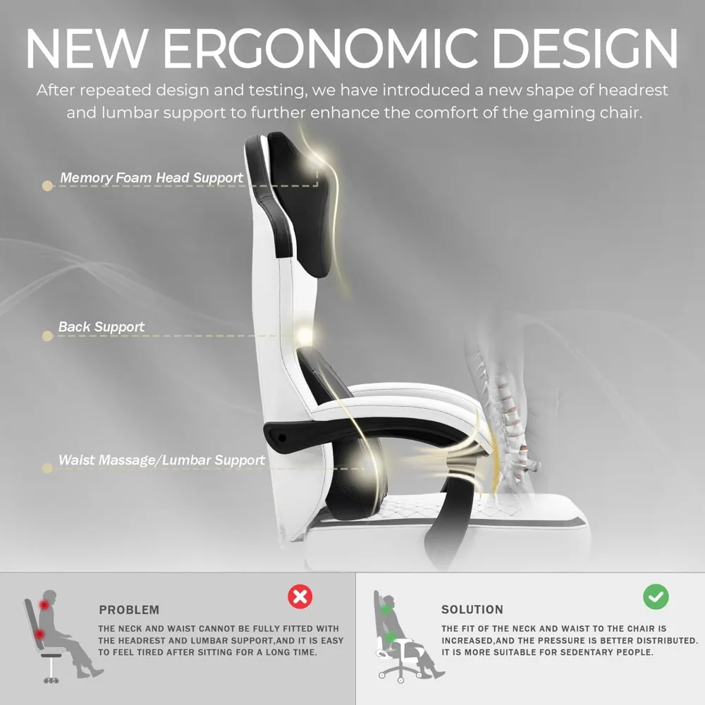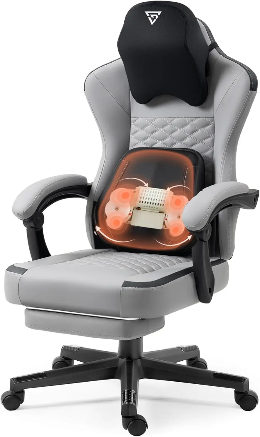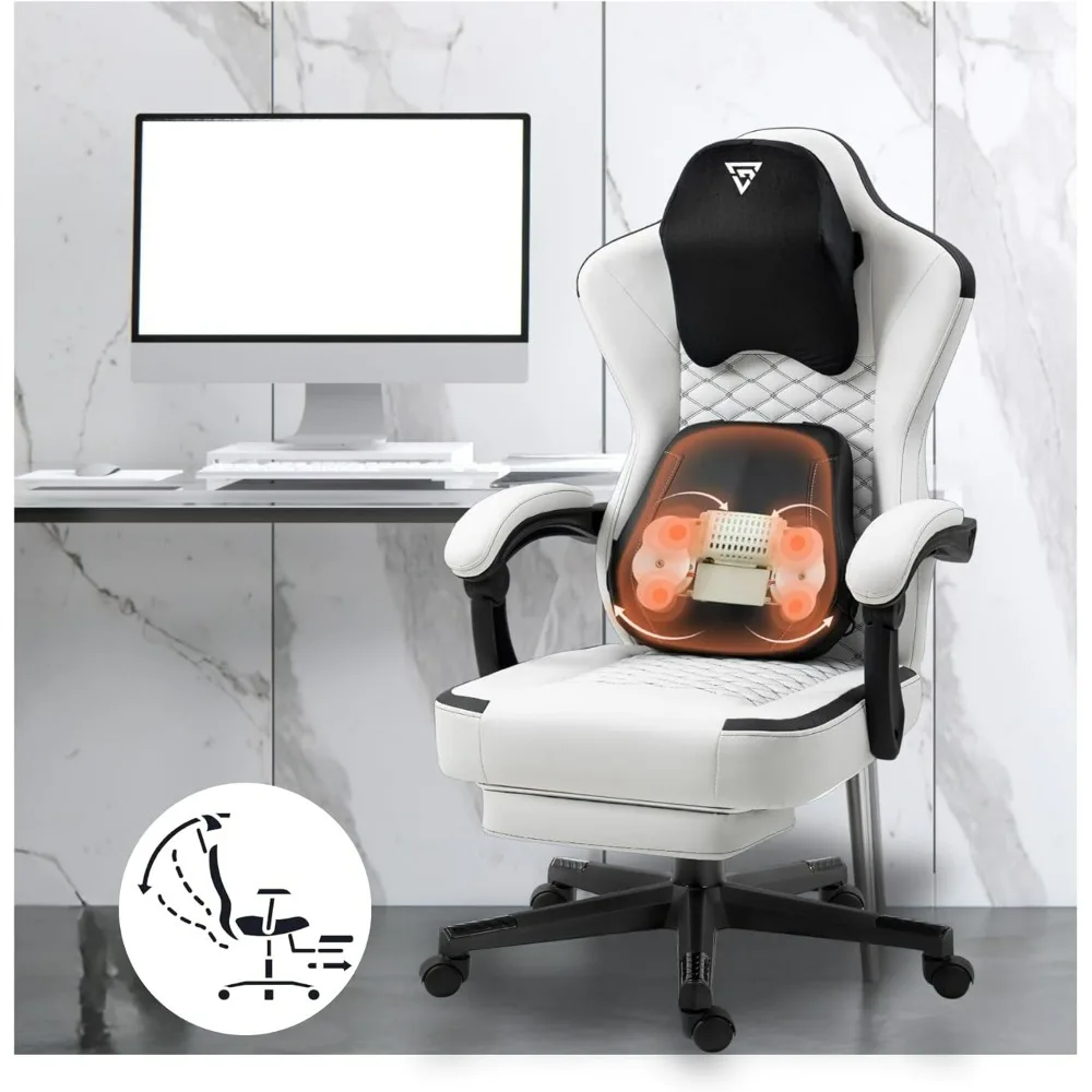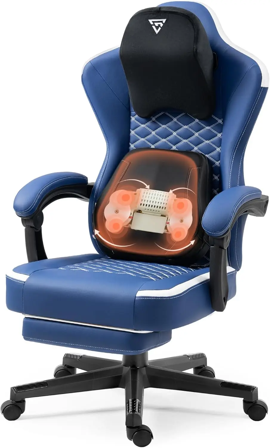 - 【Multi-Use Portable Massage Gaming Chair】gaming chair with massager is specially designed for sedentary people who are prone to low back pain. Intelligent finger sensation massage, circular kneading stiff waist for deep relaxation, effectively reducing discomfort. Adjustable heating function accelerates fatigue relief and allows you to feel warm when you’re alone or late at night. Unique double-sided design, turn the reverse side up when not massaging for a softer support experience.