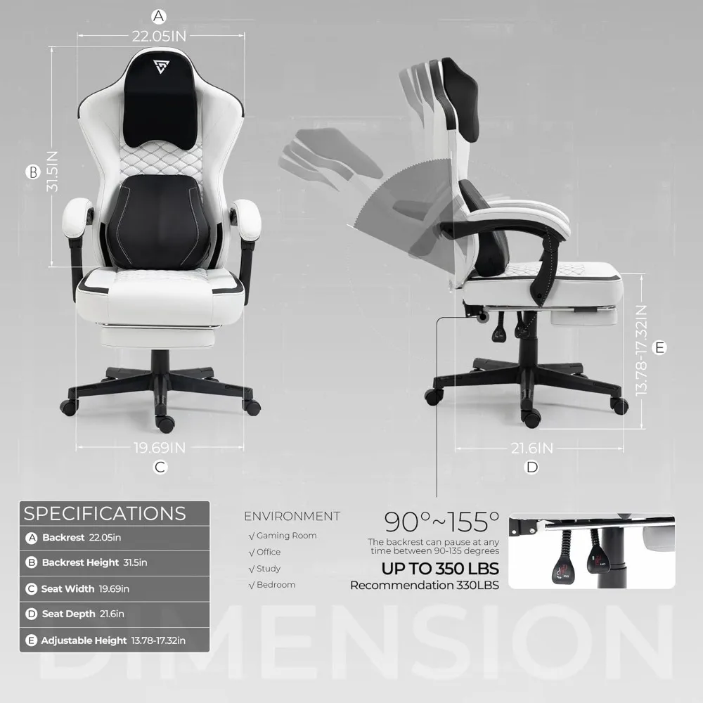 - 【Multi-Functional Ergonomic Chair】A real game chair that meets the needs should be like this: Adjustable memory headrest to better wrap-around fit and raised lumbar pillow for better support. The gaming chair with footrest plus a 155° reclining back and linked armrests, can satisfy your relaxation needs at any time. Height adjustment, 360° swivel and smooth casters ensure high mobility and freedom. Not only for gamers, it’s also the perfect partner for work, play, reading or napping.