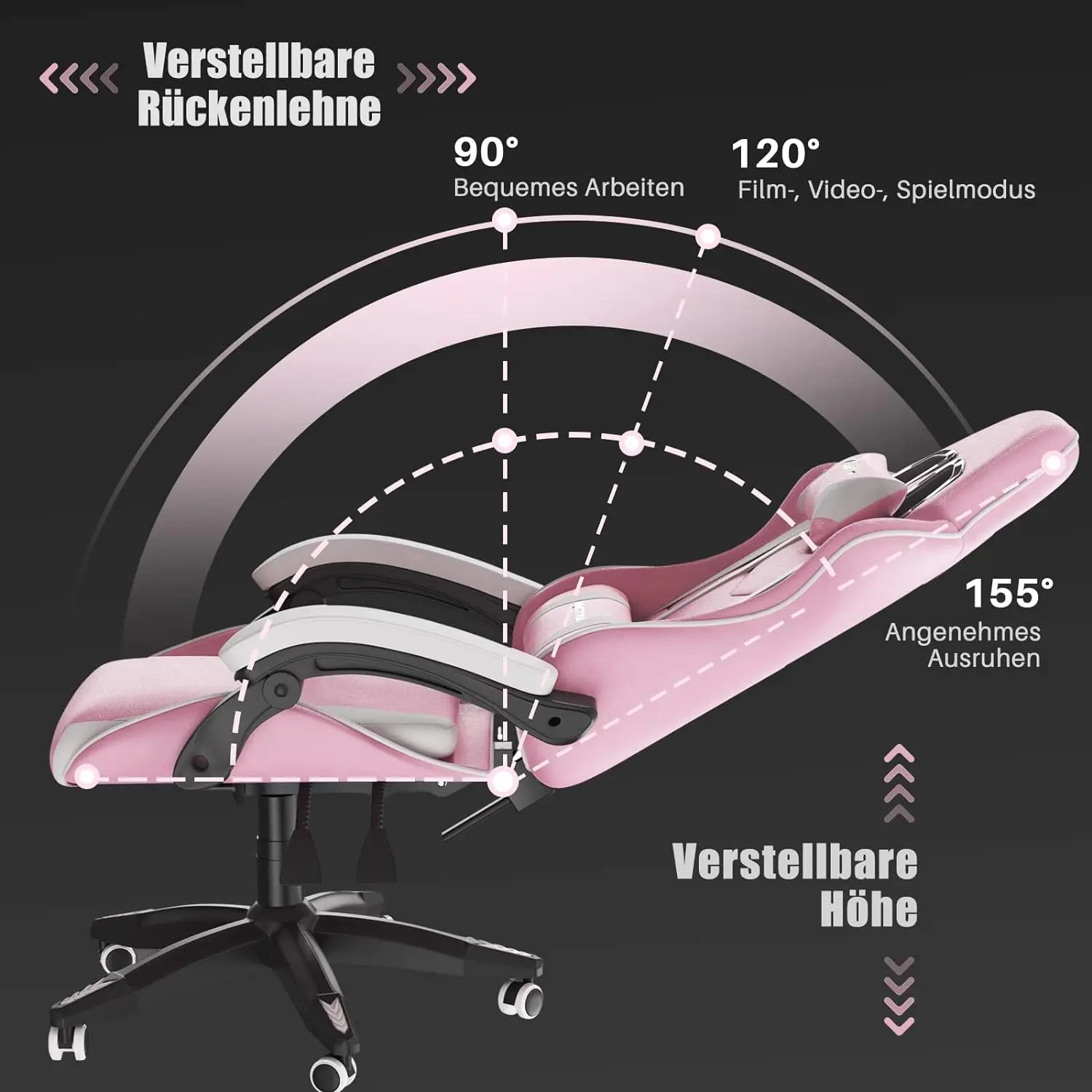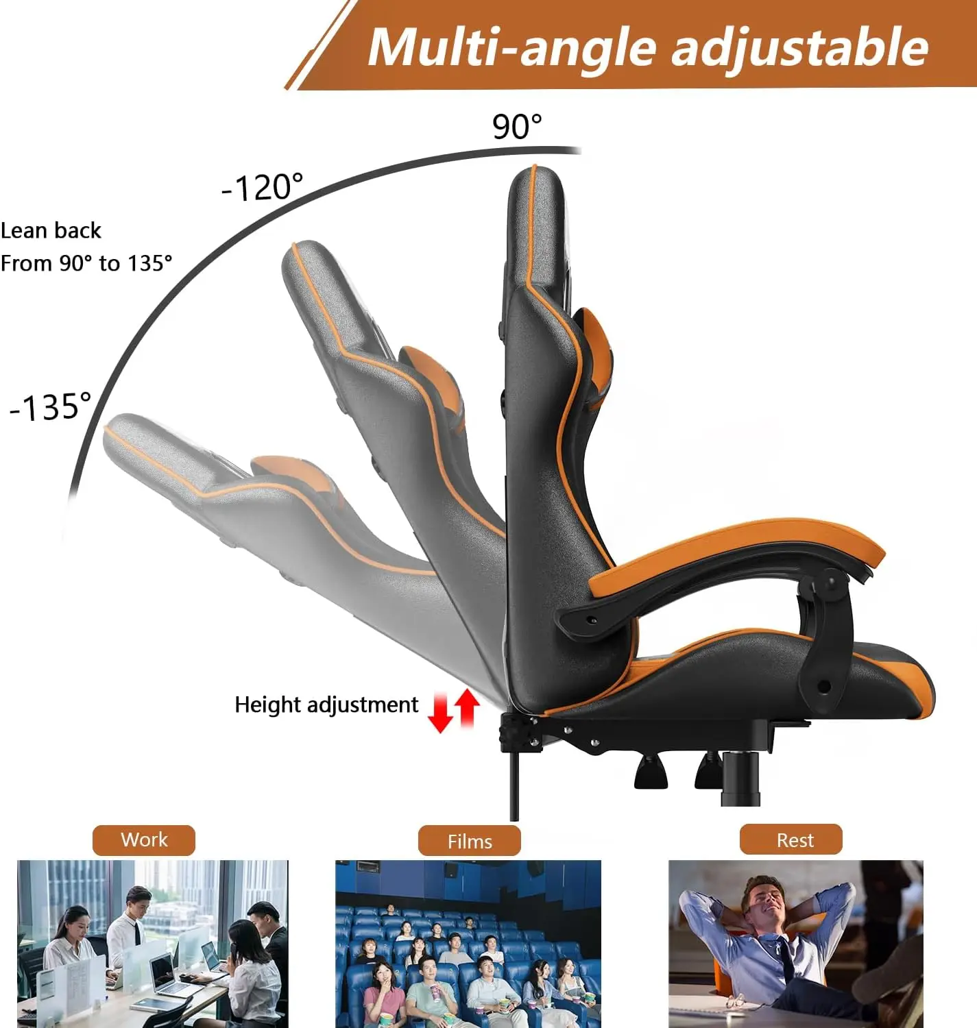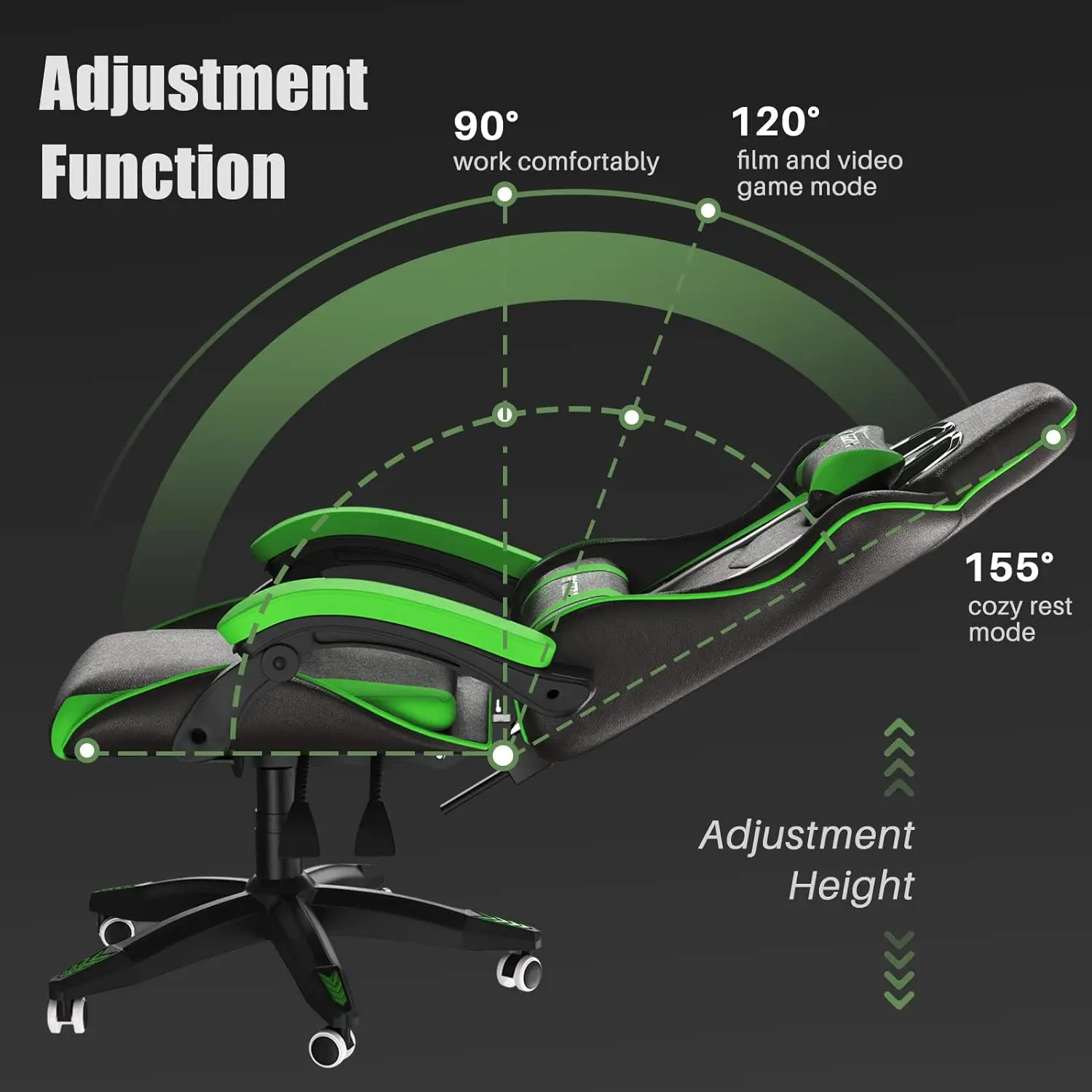 - 【Ergonomic Design for Gamer】The unique large-angle reclining function of the gaming chairs for adults can be adjusted between 90°and 155°according to your needs, allowing you to maintain a comfortable state at all times. Desk chair is equipped with a headrest and lumbar support which create personalized support and fit – adjustable and removable, fits the curve of the lumbar spine, eases your back pain from sedentary sitting. Ergonomic construction is designed to provide all-around comfort