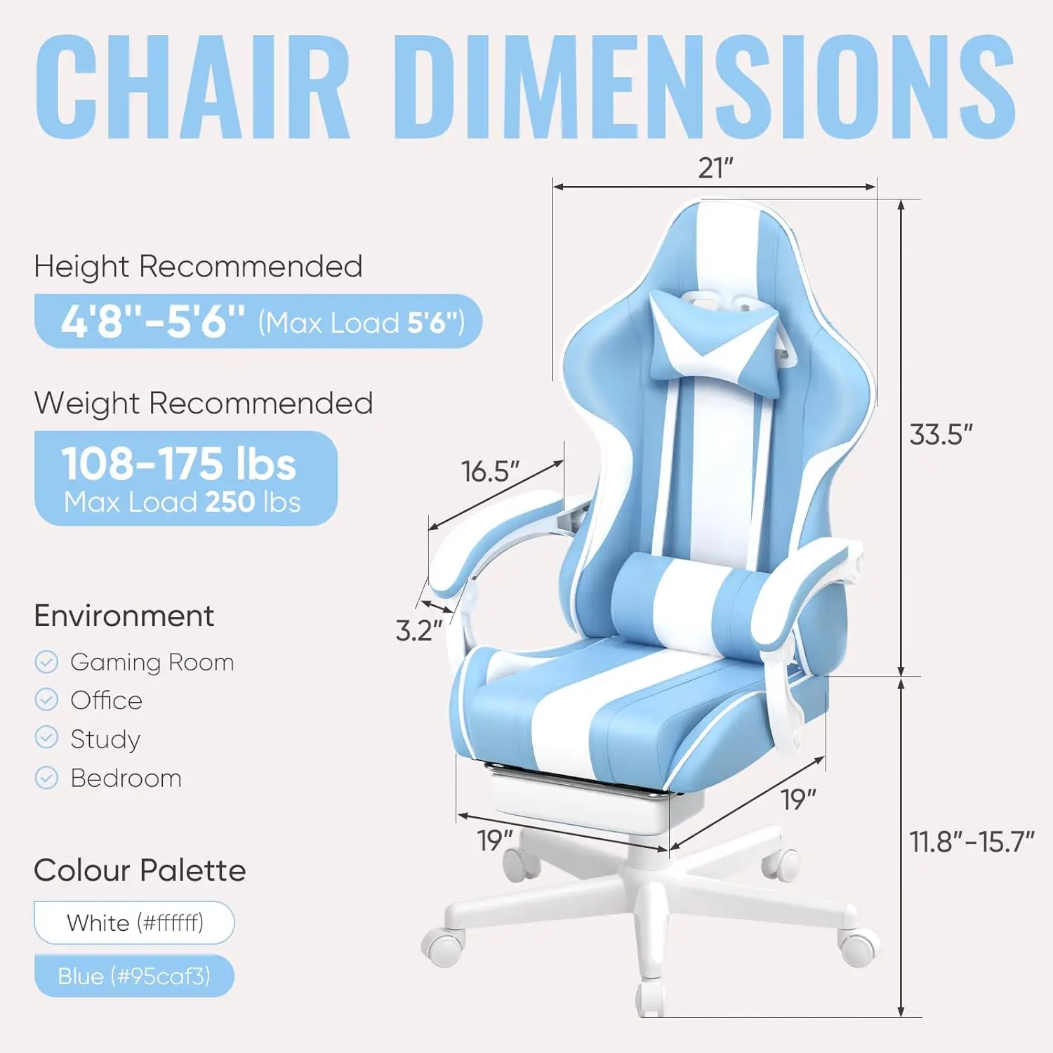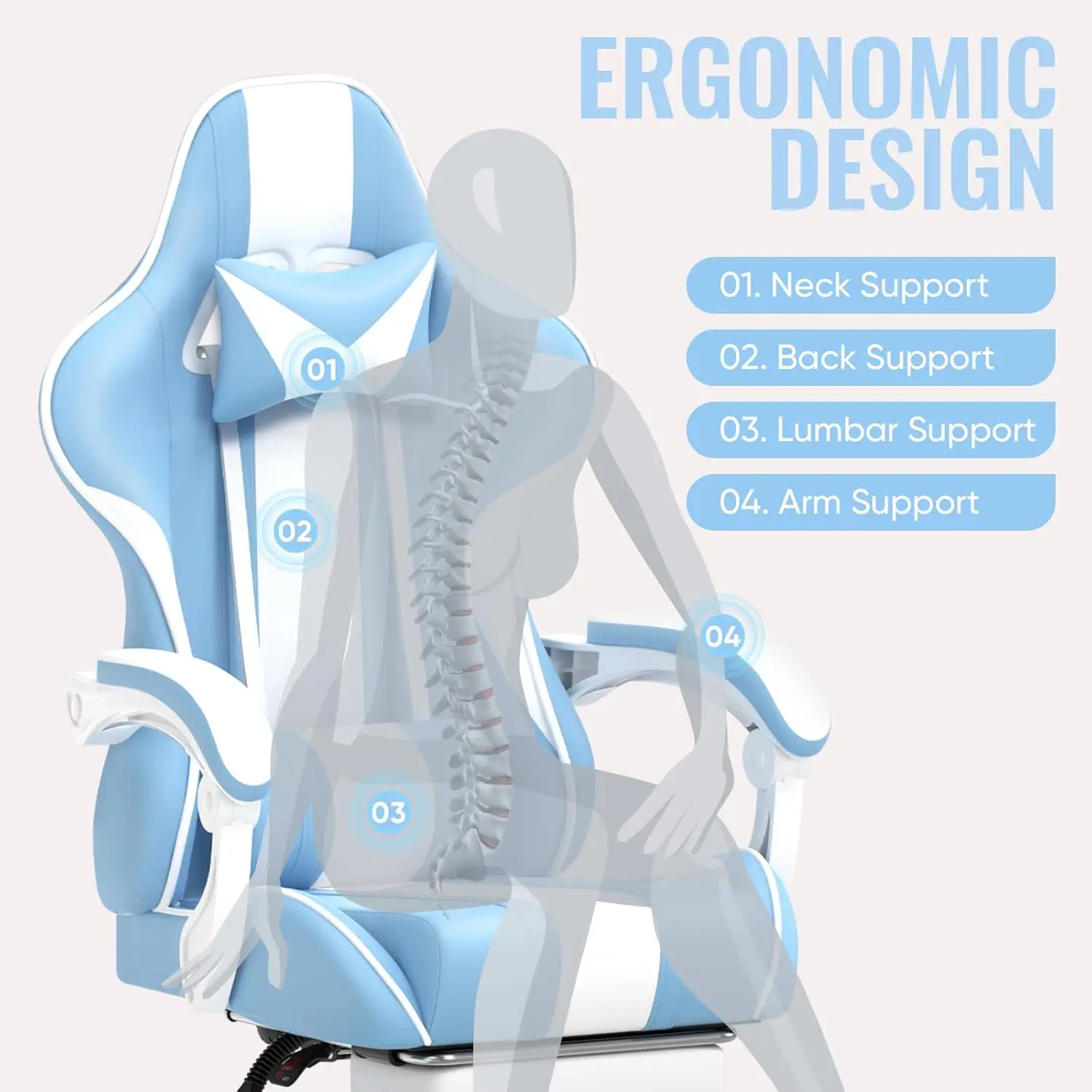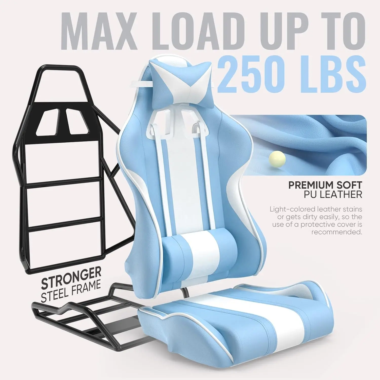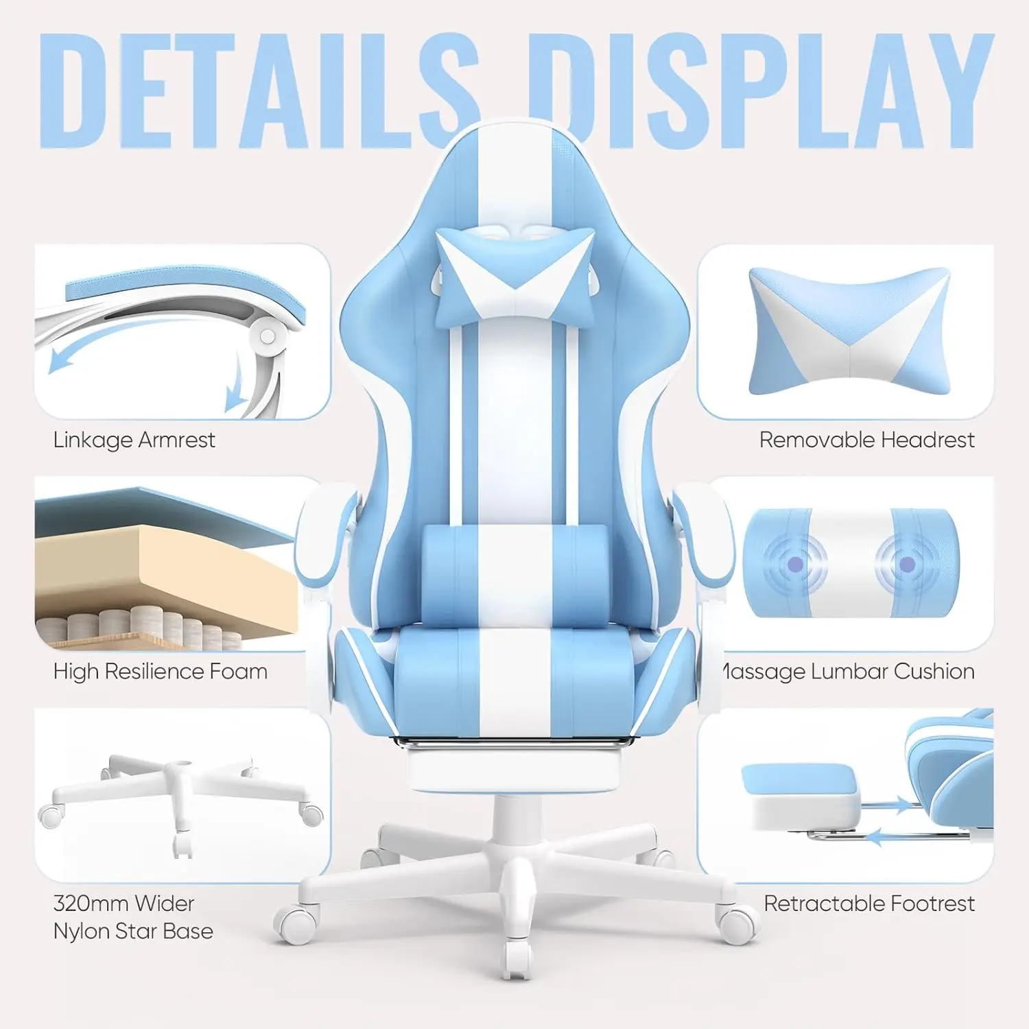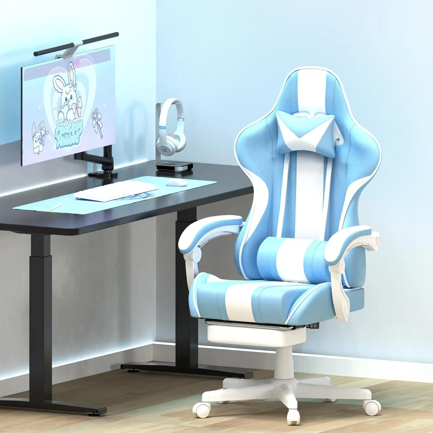 Gaming Chairs, Ergonomic Racing Style PC Game Computer Chair with Headrest Lumbar Support Adjustable Recliner (Light Blue)
