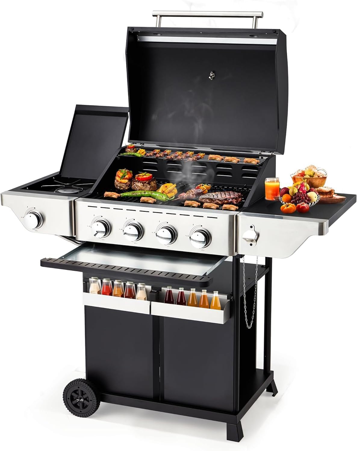 - Stainless Steel 4 Burner Gas Grill: The propane gas grill has 4 stainless steel burners and side burners, just press and turn the control knob quickstart. The gas grill offers a total of 42,000 BTU of cooking power, including 32,000 BTU in the main cooking space and 10,000 BUT in the side burner.A thermometer on the stainless steel lid makes it easy to monitor the propane grill’s internal temperature without opening the gas grill covers.
