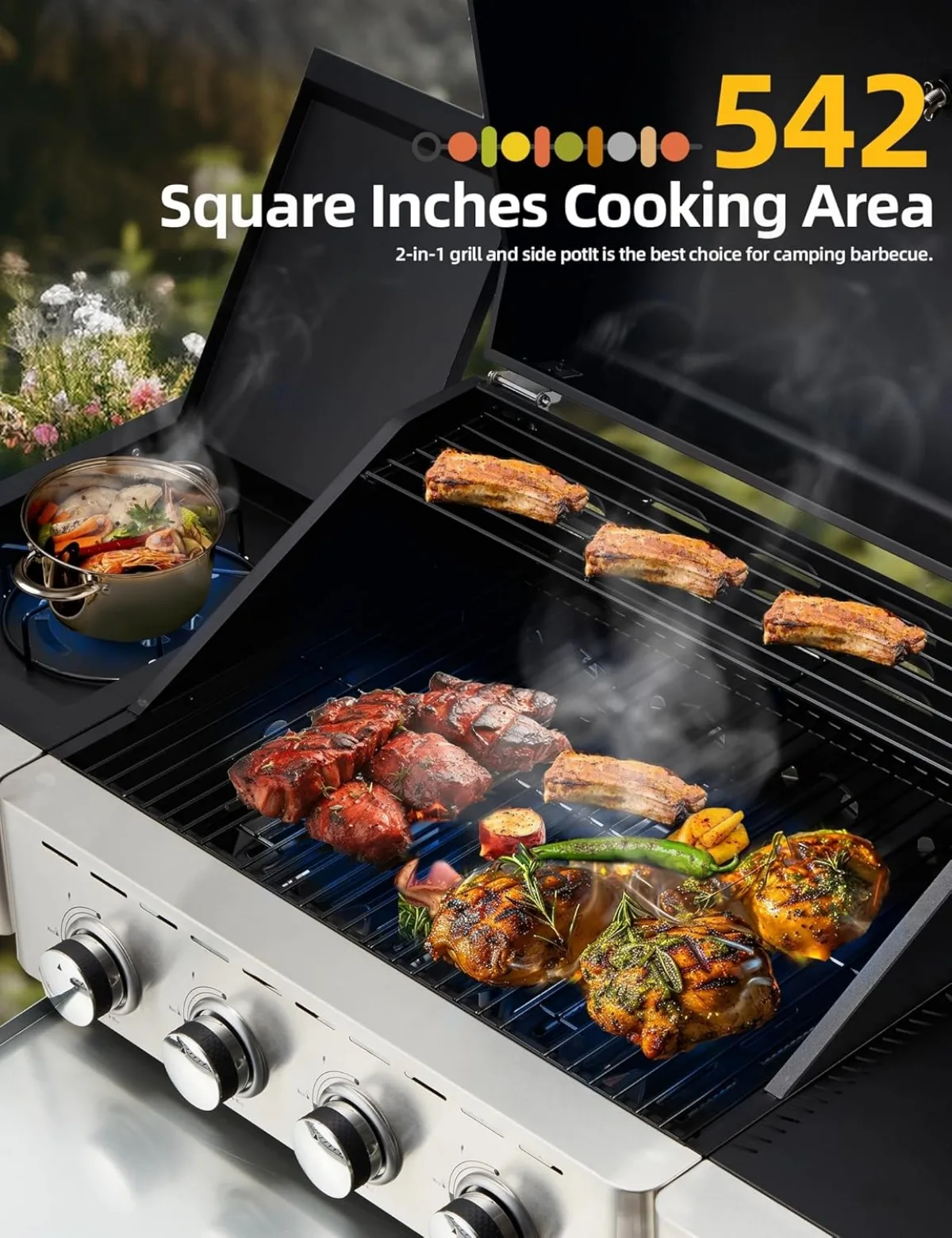 - Side Burner with Cover: The gas grill’s 10,000 BTU side burner with cover is perfect for making sauces and side dishes or boiling water. When the side burner is not in use, the cover folds down to provide extra space for working or preparation. This portable grill propane is perfect for any outdoor space, such as backyards, gardens, patios, yards and balconies in most homes, making it a four-season alternative for outdoor cooking. It is a portable outdoor grill.