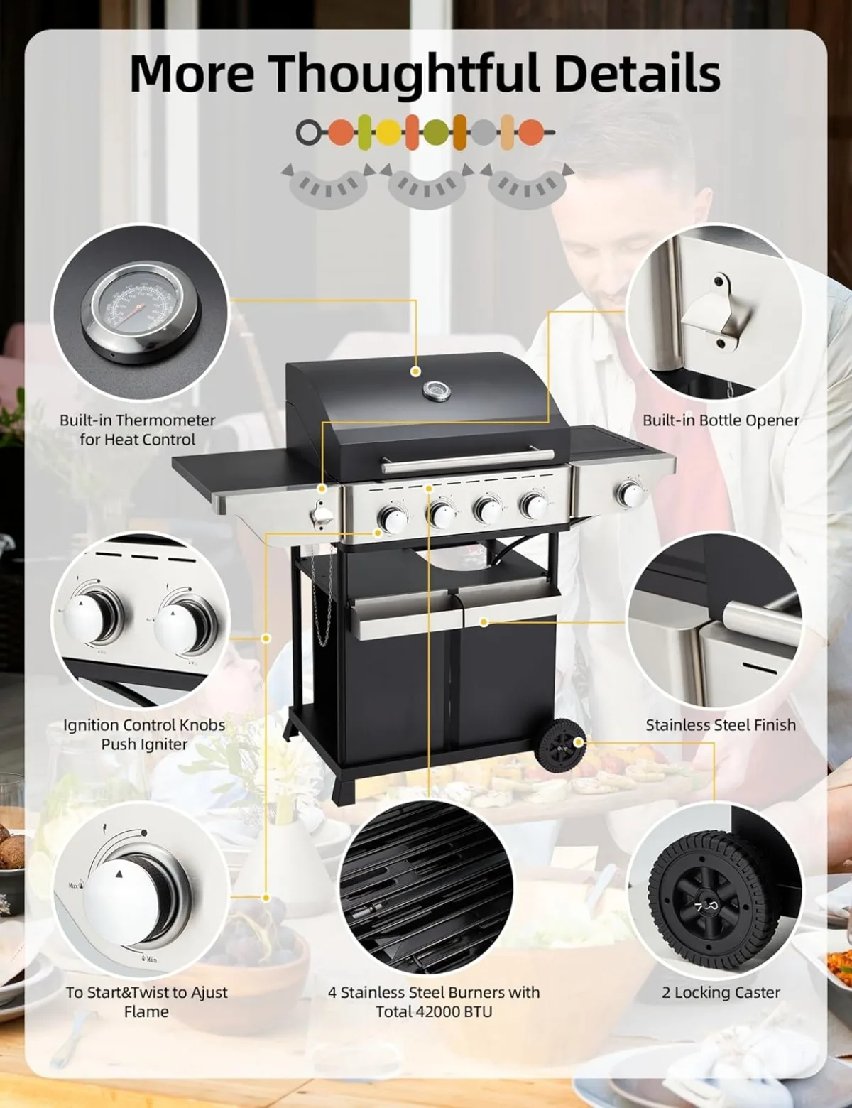 - Stainless Steel 4 Burner Gas Grill: The propane gas grill has 4 stainless steel burners and side burners, just press and turn the control knob quickstart. The gas grill offers a total of 42,000 BTU of cooking power, including 32,000 BTU in the main cooking space and 10,000 BUT in the side burner.A thermometer on the stainless steel lid makes it easy to monitor the propane grill’s internal temperature without opening the gas grill covers.