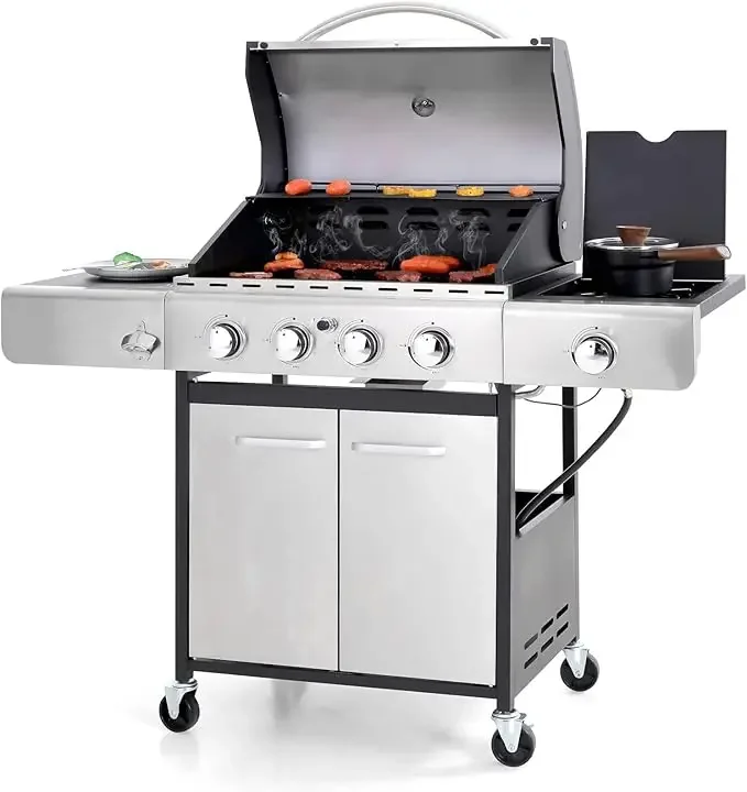 - 【Unique Design】Large storage cabinet easily store your gas tank and offer sufficient space for grilling accessories; Exclusive stainless-steel finish for increased style and durability; Double-layer lid ensures excellent heat retention for keeping food tasty and warm evenly; Built-in thermometer monitors temperature in real-time; 4 Galvanized casters for easy transport
