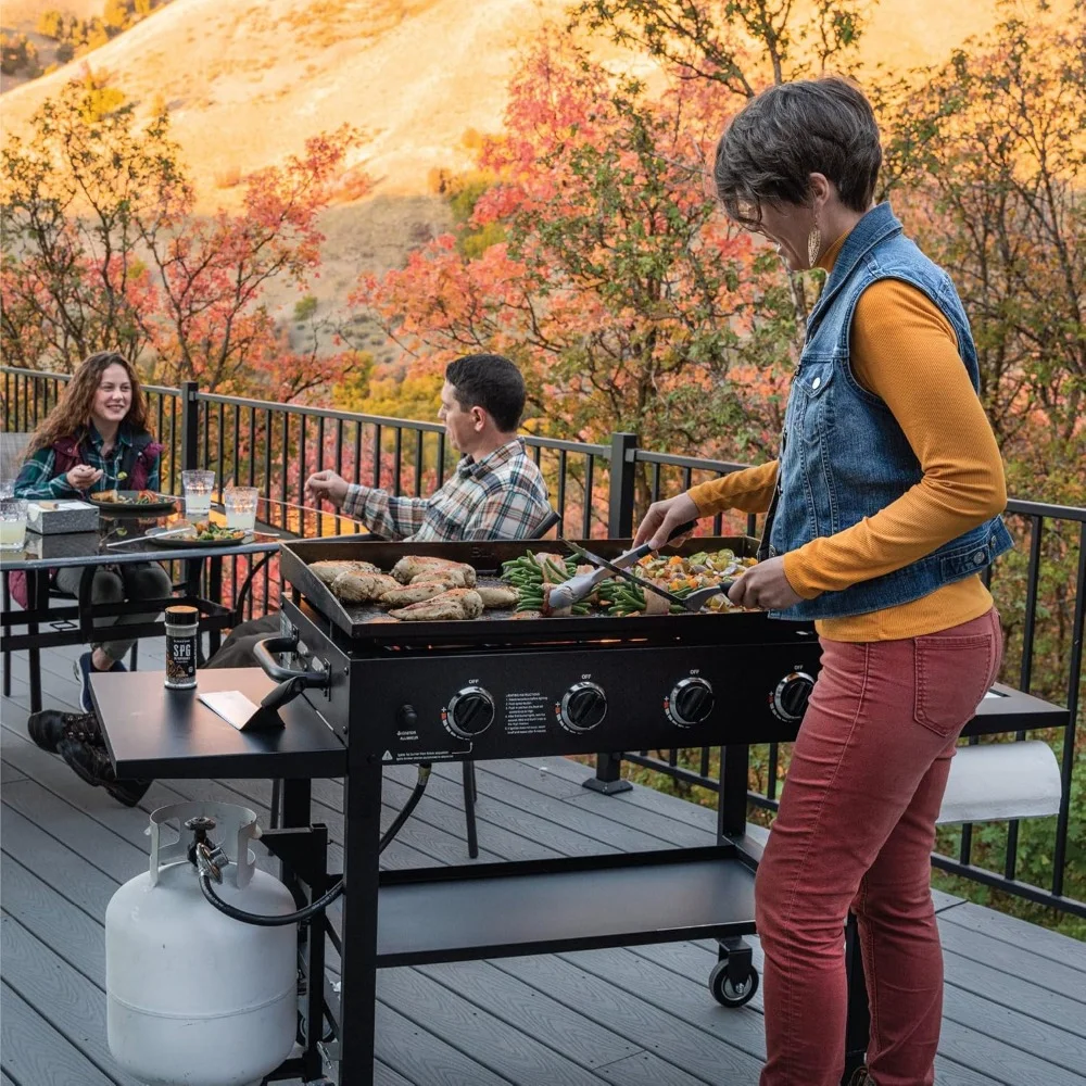 - RESTAURANT STYLE COOKING – With 720sq inches of flat top grilling, this griddle is perfect for breakfast, lunch and dinner. Cook eggs, pancakes, quesadillas, grilled cheese, steak, potatoes, teppanyaki style foods and more. Also enjoy a bottom shelf, side shelf and the NEW side shelf with cutting board, paper towel holder and trash bag hooks.