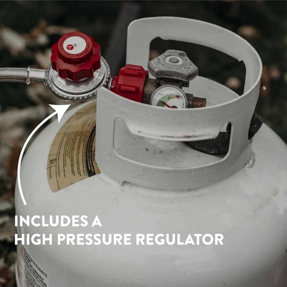 - PSI ADJUSTABLE PROPANE REGULATOR – Steel braided, adjustable from 0-20 PSI for pin point heat adjustment, the B-5350’s propane regulator is the reliable connection you need to ensure a leak-free, fully controlled burner experience; measuring at 4ft, compatible with 20 lb propane tanks (QCC-Type 1), and fully adjustable, the propane regulator will allow users to go from sizzle to max output with the turn of a knob