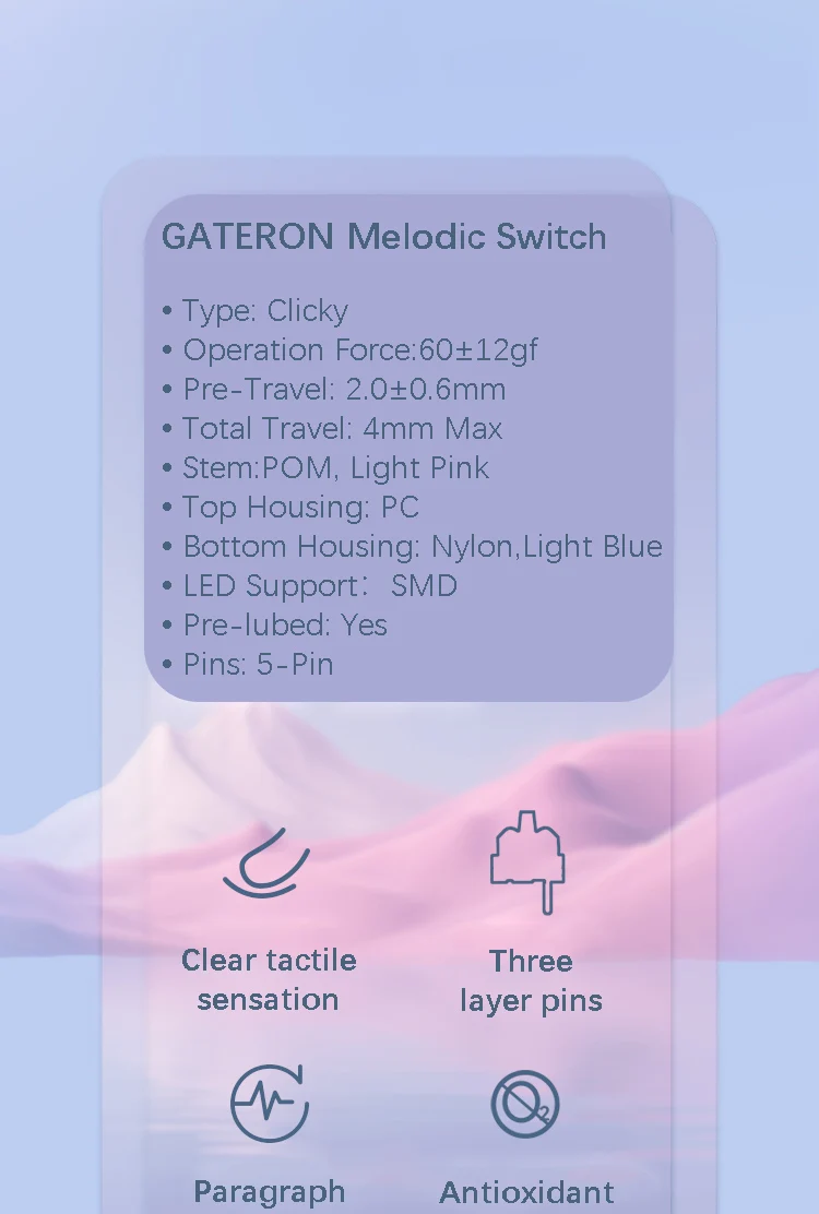 The Melodic Switch offers a full tactile feeling with a strong rebound, providing a tactile experience that stands out from the crowd.Factory pre lubrication