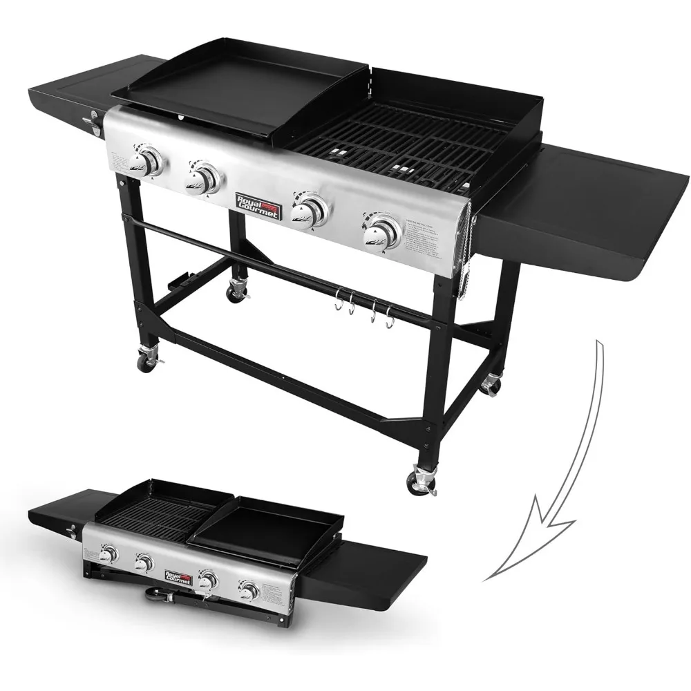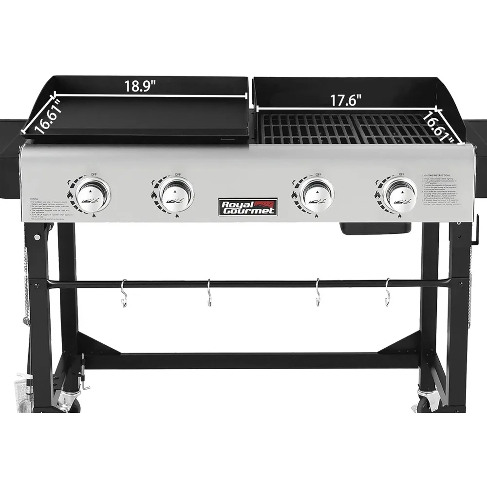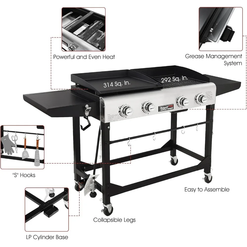 - Combo Design: Combination of gas grill and griddle with two individual cooking zones, each has 292 sq. inches for cooking, totaling 584 sq. inches of cooking space, over 4 burners with an output of 48,000 BTUs.