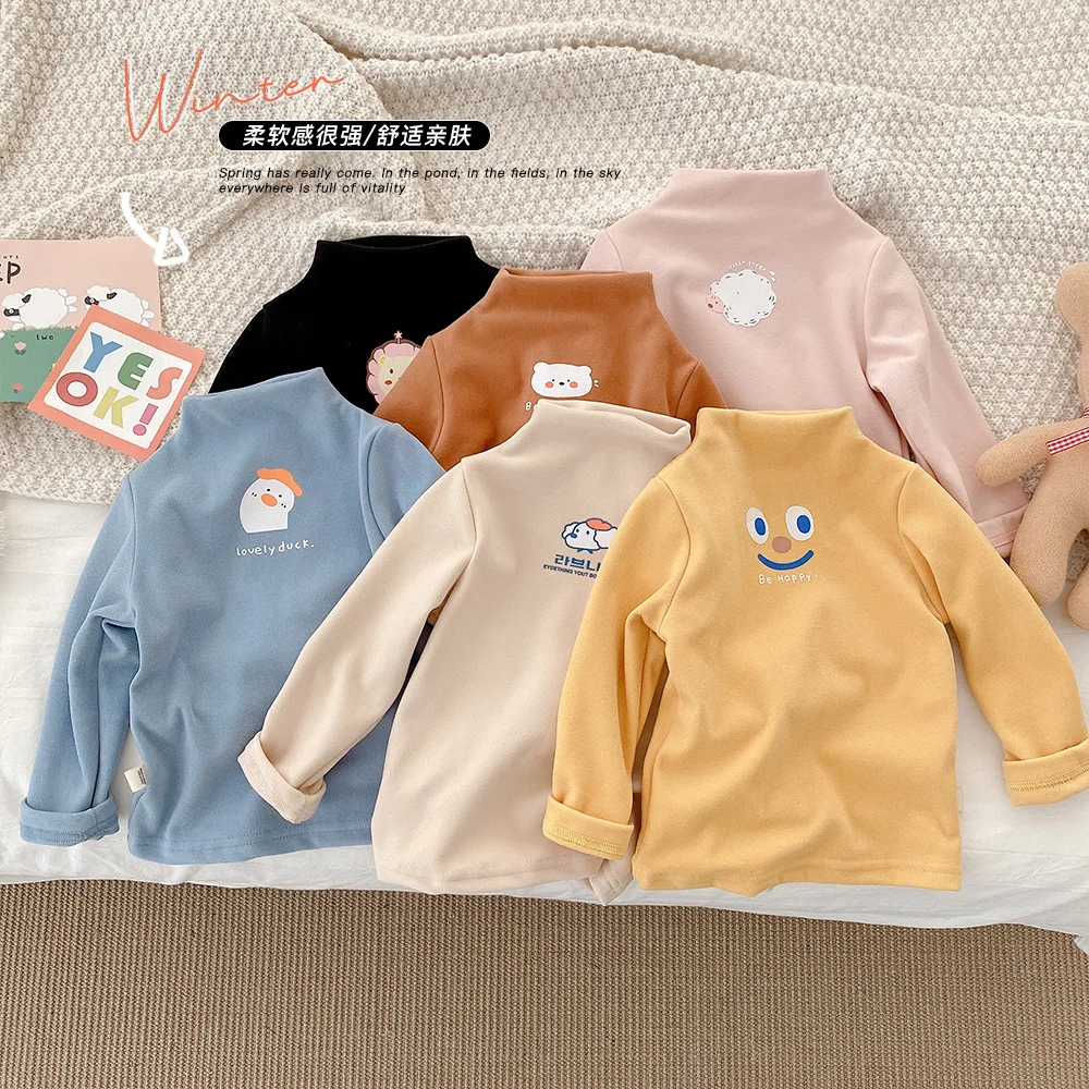 Girls High Neck Bottom Shirt Printed Velvet Autumn Winter Cotton Long Sleeved Toddler Girl Inner Top Warm Base Kids Girl Shirt