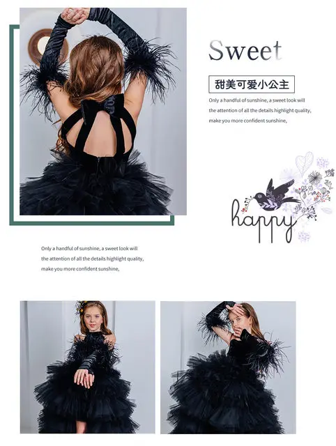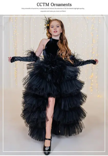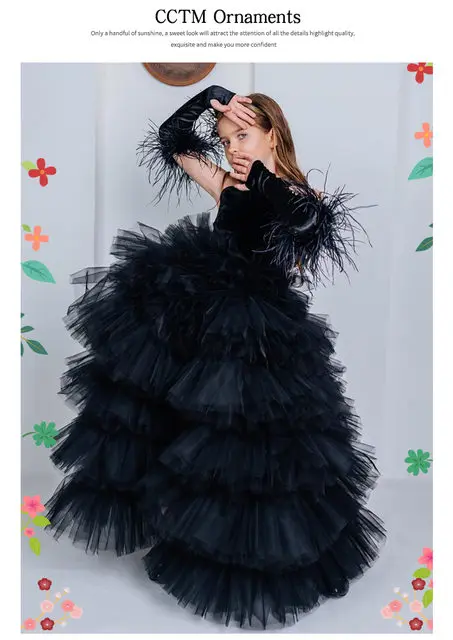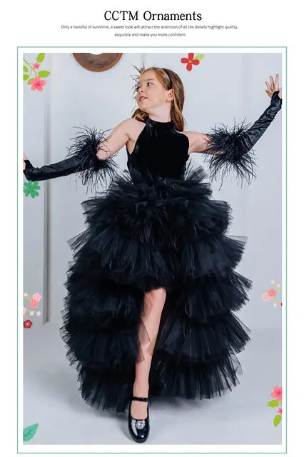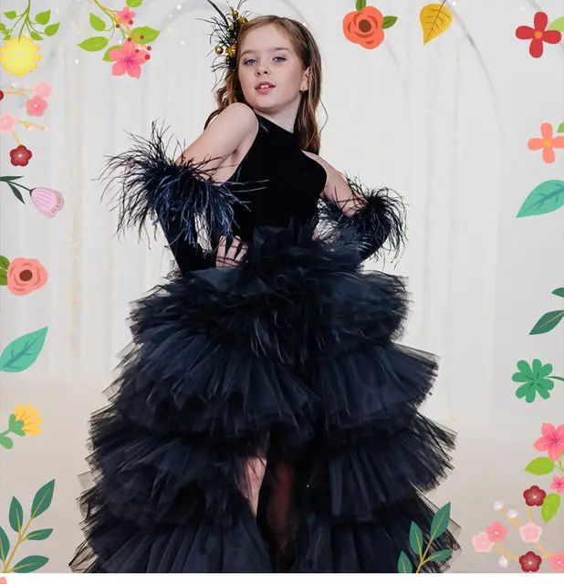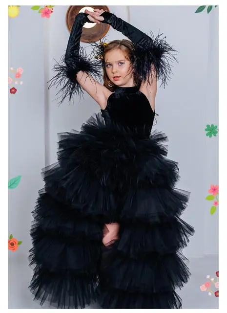 Girls Pageant Dress High Neck Halter Feather Sleeves Tiered Tulle Gown Formal Party Wedding Flower Girl Birthday Costume