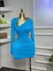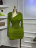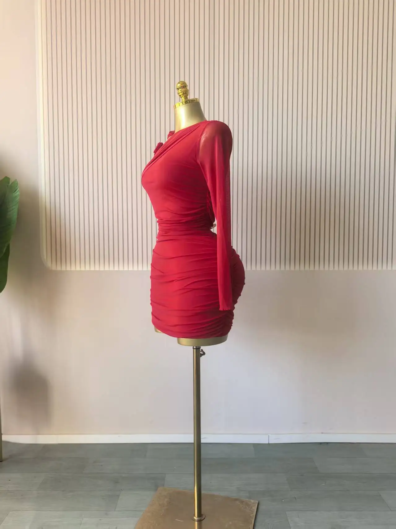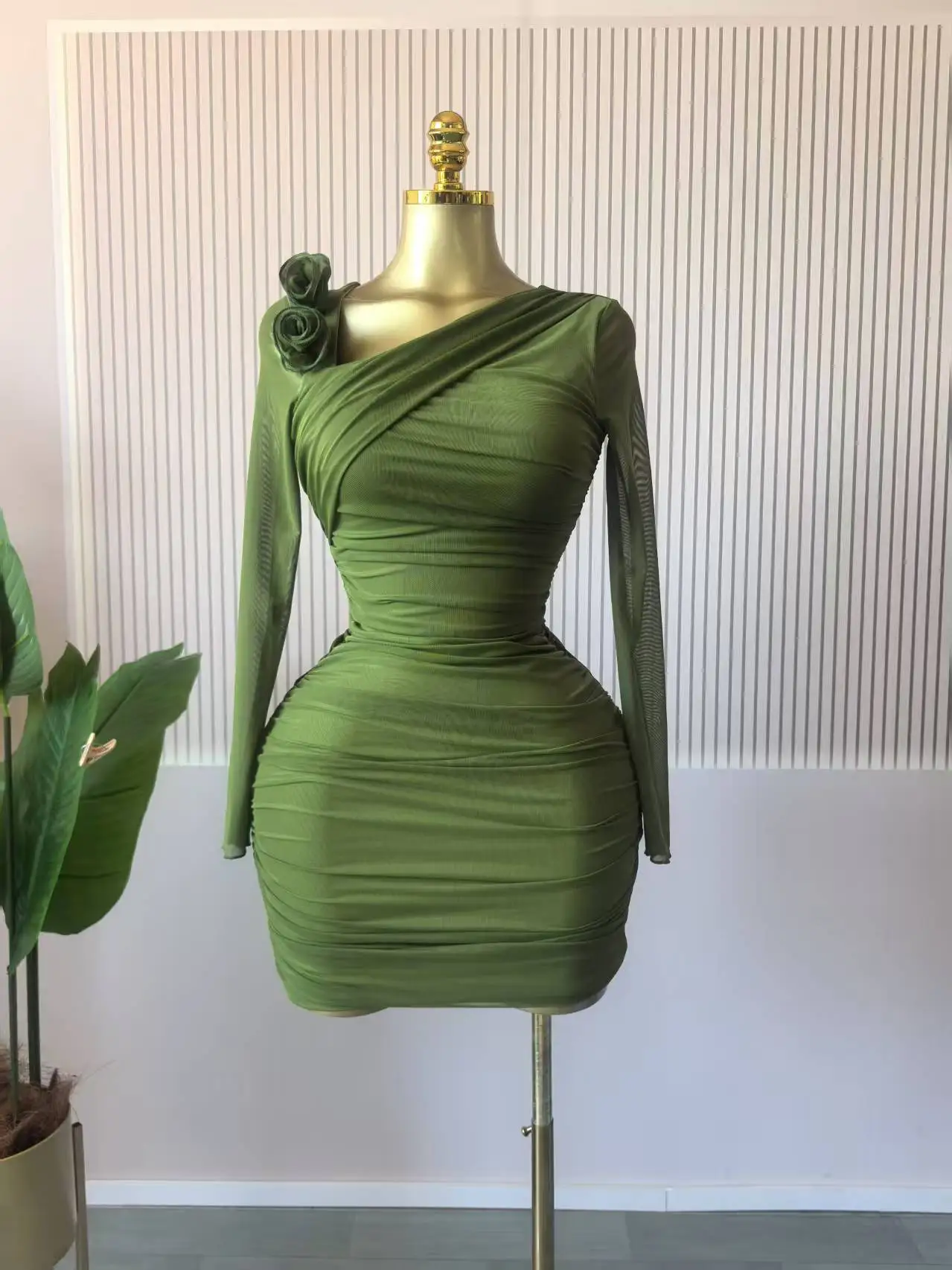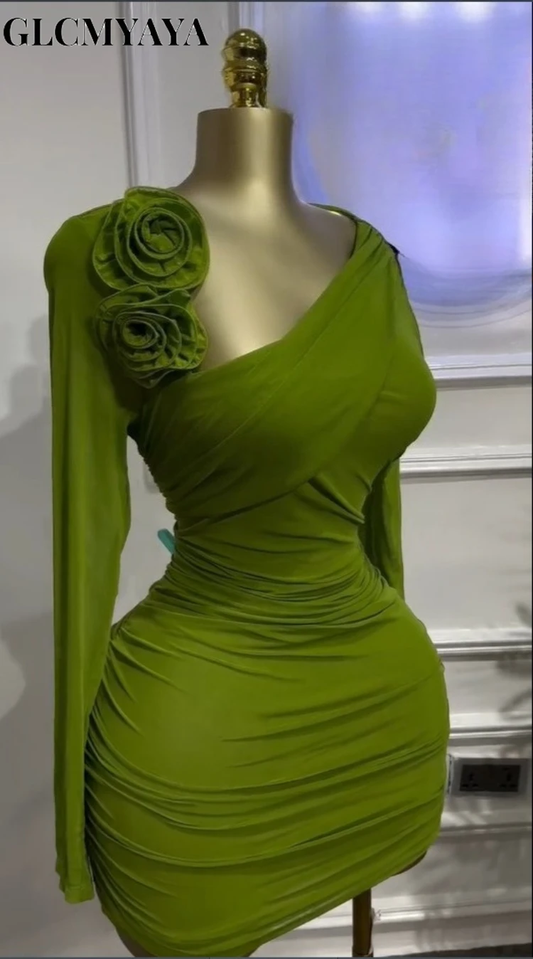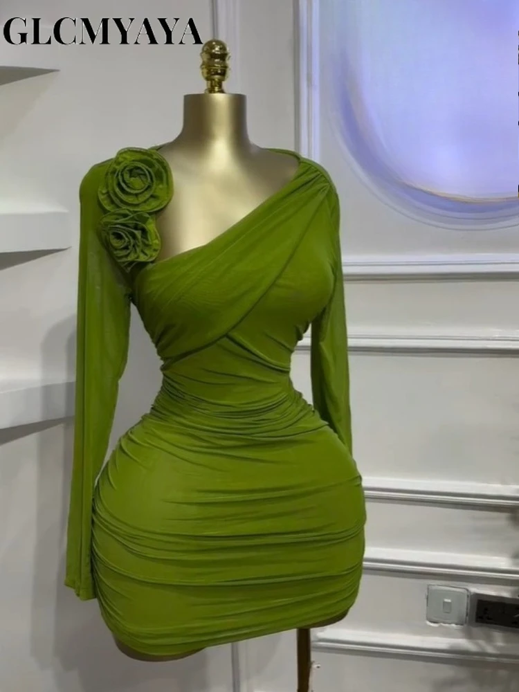 GLCMYAYA Women Long Sleeve Floral Applique Skew Collar Stacked Ruched Bodycon Midi Dress Vacation Holiday Party Birthday Dresses