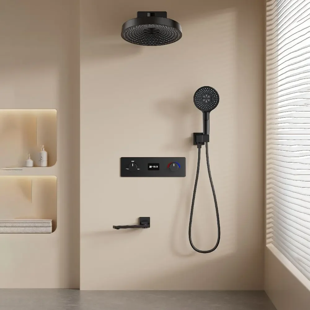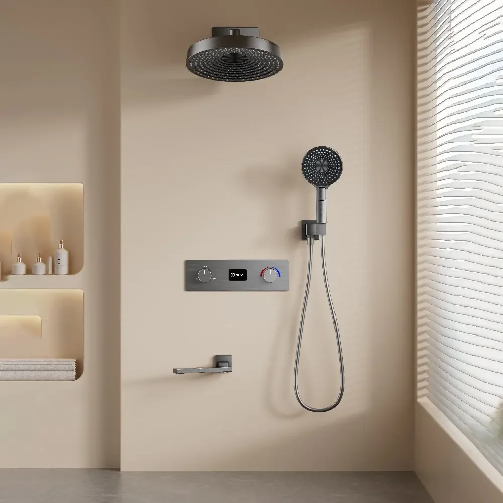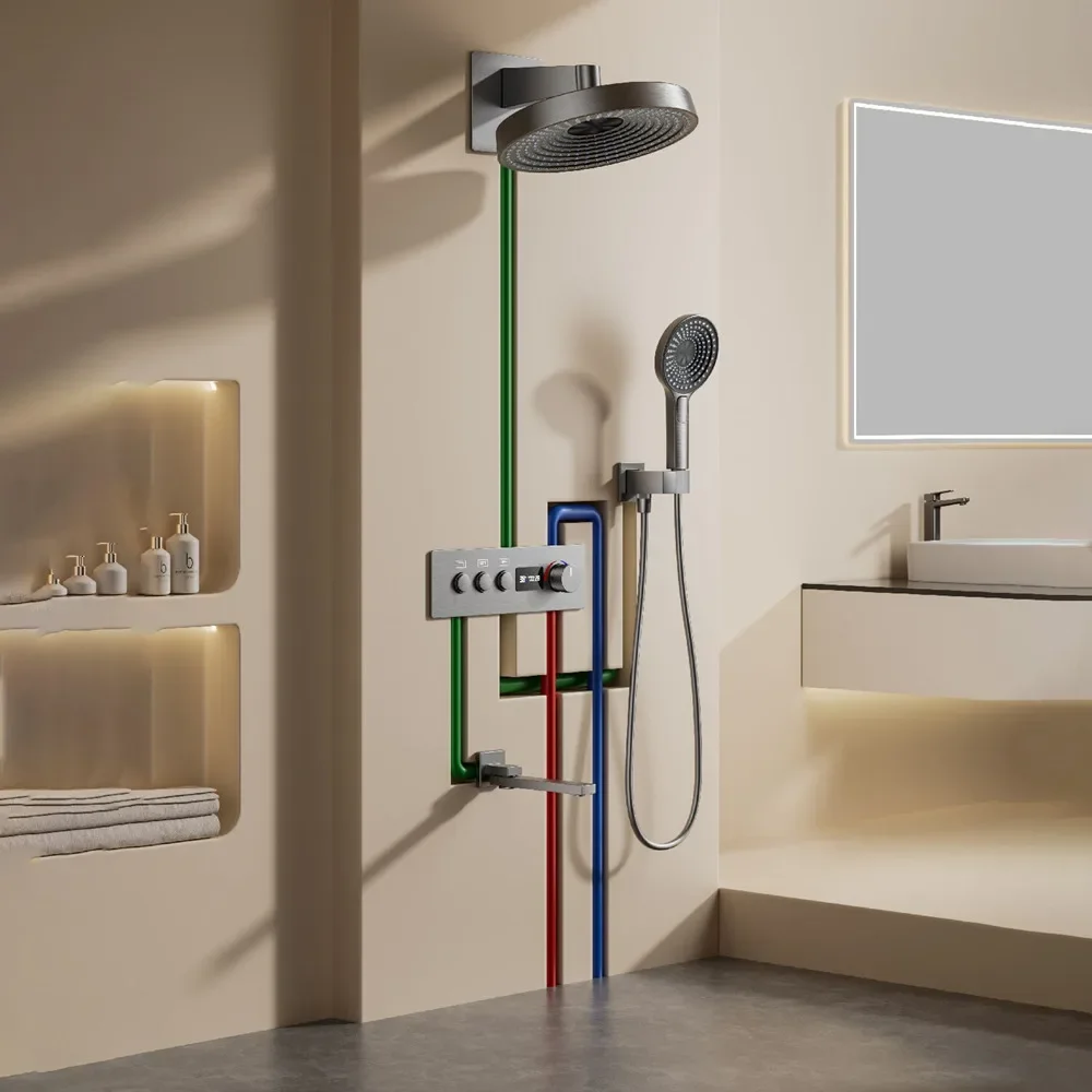 Grey Thermostatic Bathroom Shower Faucet in Wall Black Bath and Shower Faucet Set Thermostatic Mixer Bath and Rainfall Shower