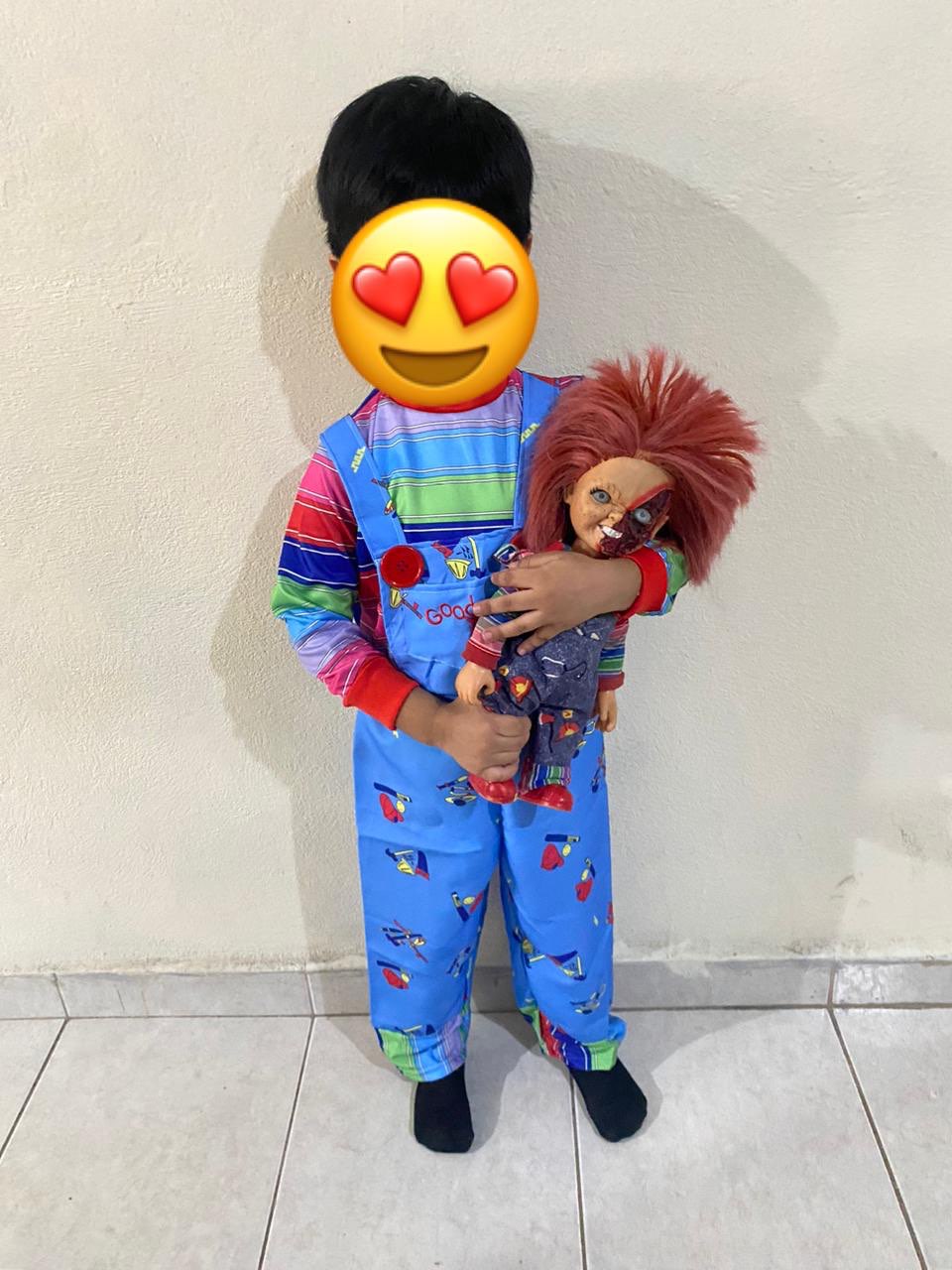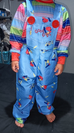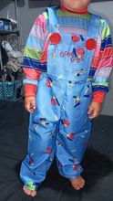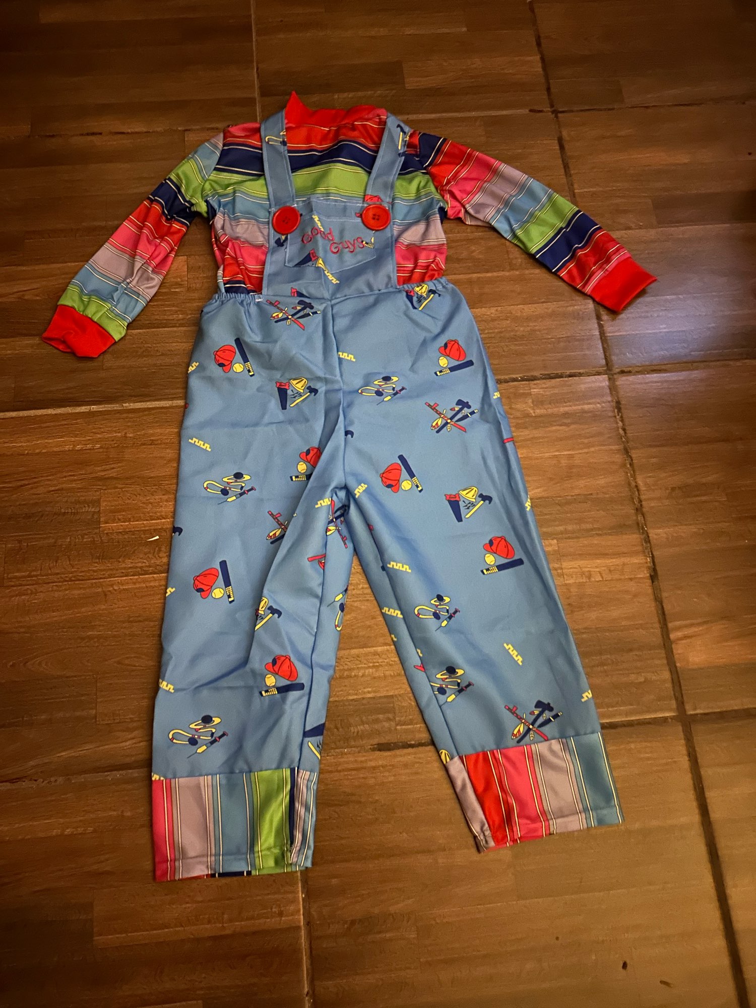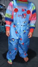 ●This costume includes a long-sleeved jumpsuit And Tattoo stickerswith printed details that looks like Chucky’s blue overalls and striped shirt; shoes, makeup and prop knife not included