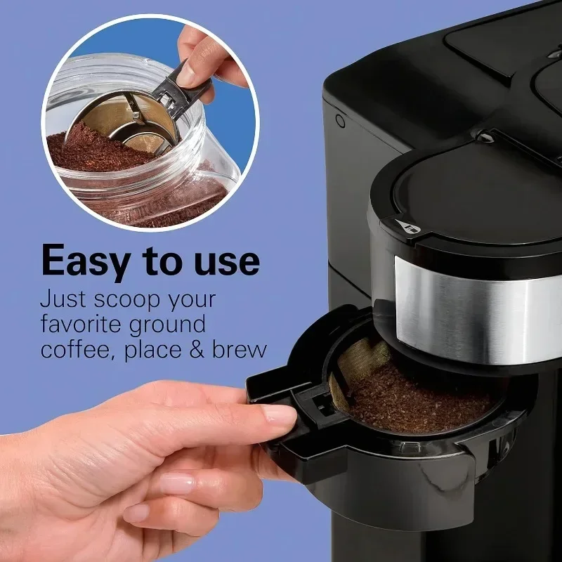 - 2 WAYS TO BREW:SINGLE CUP OR FULL POT. Brew a single-serve cup or a full pot of coffee with your favorite ground coffee. Whichever way you brew, the Hamilton Beach Programmable Coffee Maker makes it easy to do both. Not compatible with K-Cup* pods.Filter type:Reusable