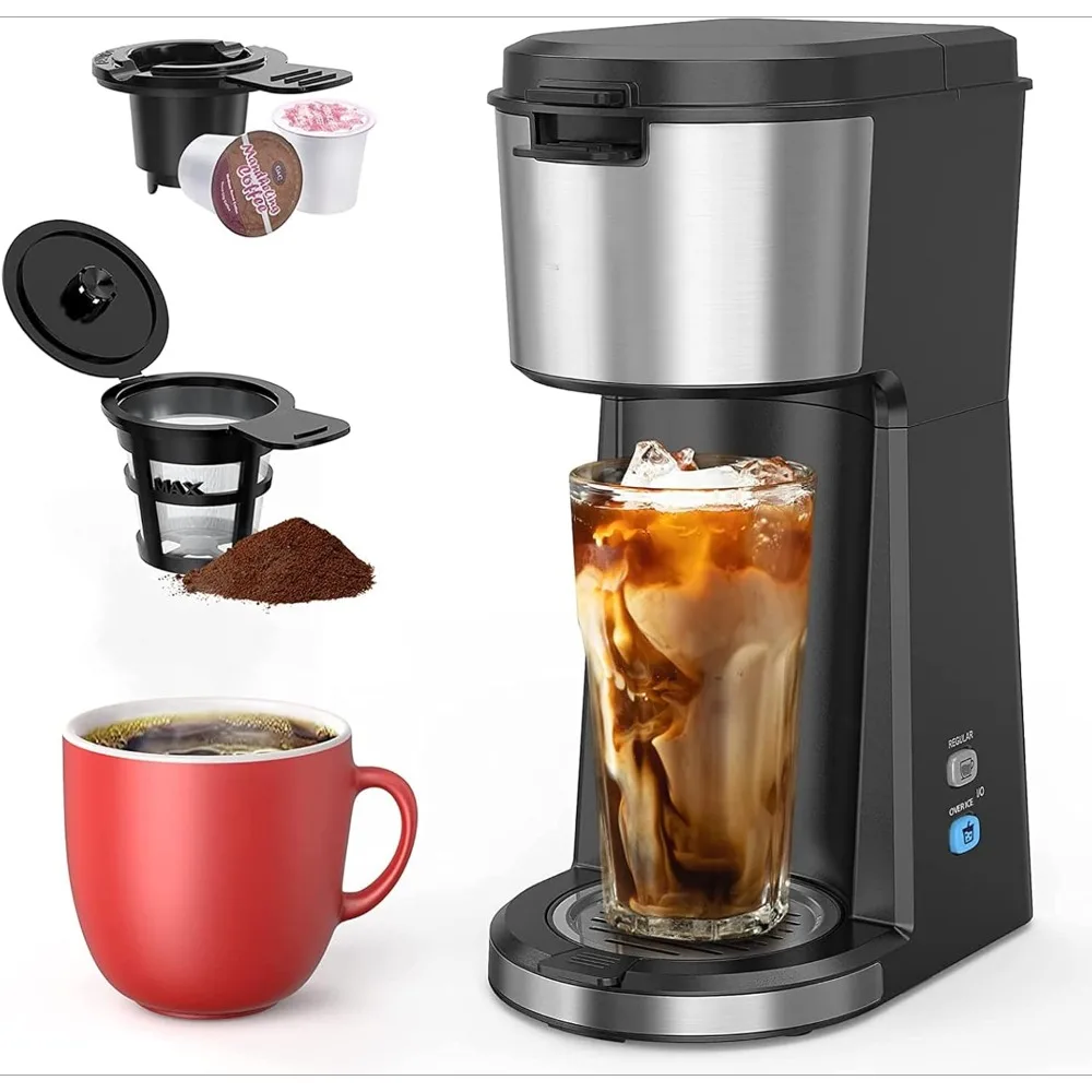 - All-in-One Iced and Hot Coffee Maker: Built with deep coffee extraction technology, this ice coffee maker brews extra strong hot coffee over ice and delivers the perfect cup of fresh, flavorful iced coffee. Simply press the “REGULAR” button to enjoy your delicious hot coffee in just 4 minutes. Both hot and iced coffee can be made using a k pod or with your favorite ground coffee in this single serve coffee maker. Only 6oz of water is used for best flavor if using pods to make iced coffee.