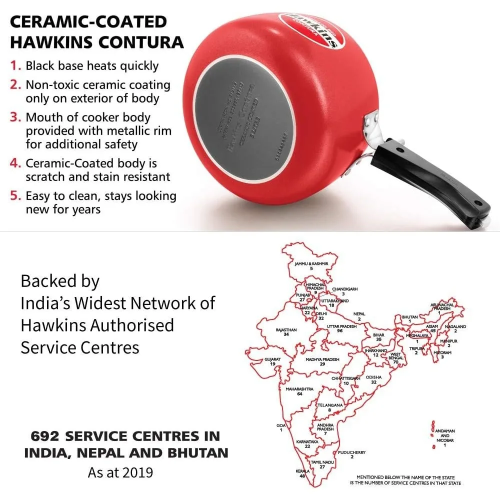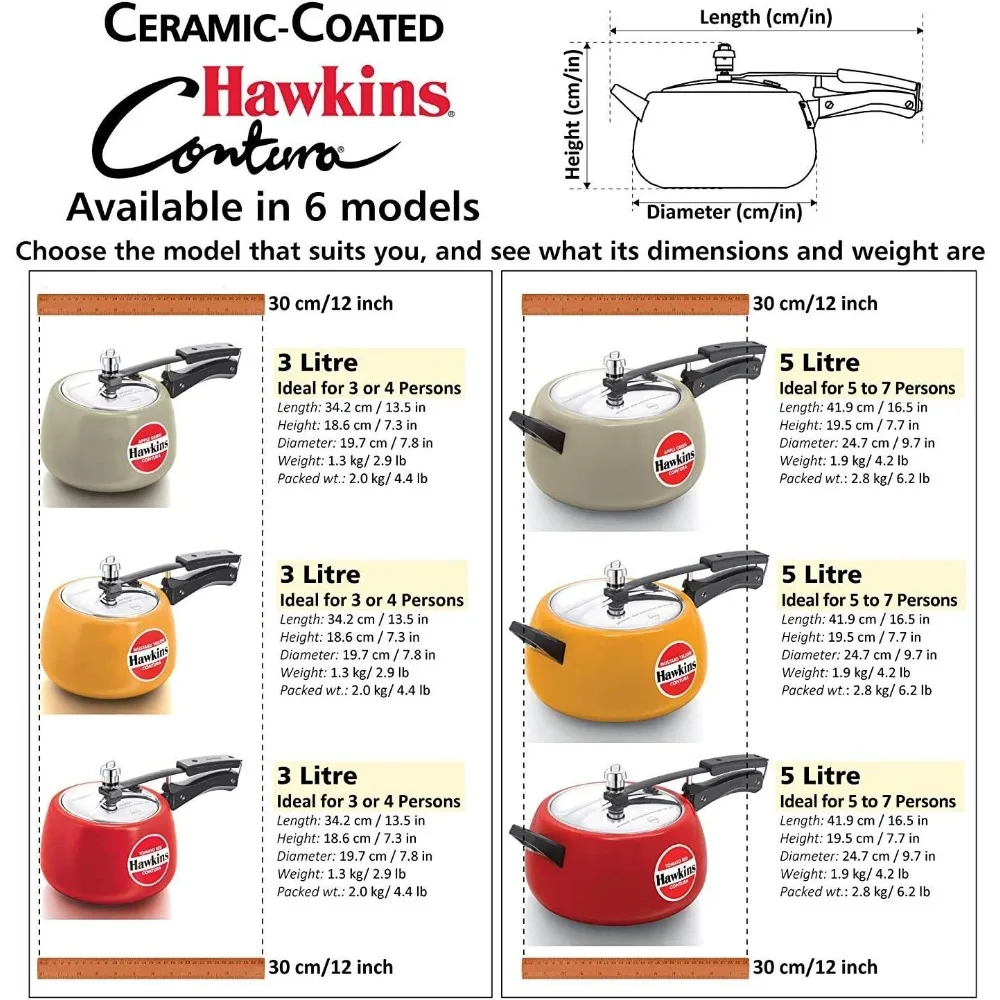 - The 3 Liter Ceramic-Coated Hawkins Contura Pressure Cooker has German, high-quality, non-toxic ceramic coating only on the exterior and the base of the body