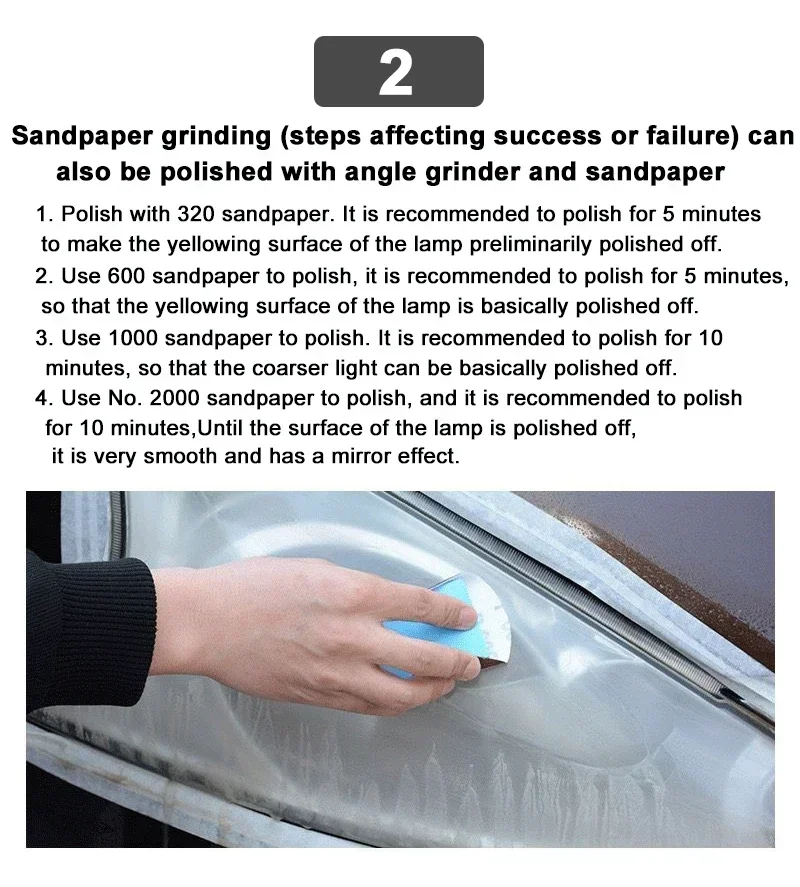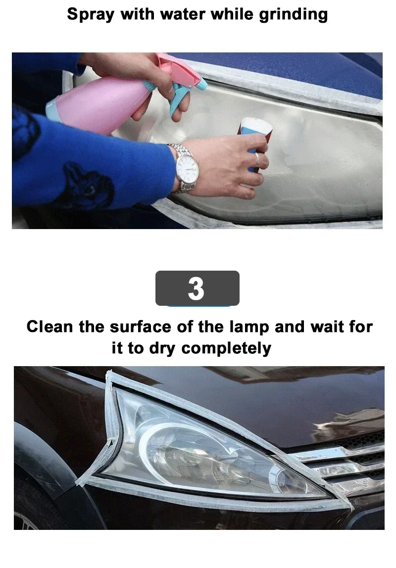 3,【Easy To Use】Headlight Cleaner Spray is convenient to use. Just sand with coarse sandpaper first, spray with repair fluid, and then sand with fine sandpaper.
