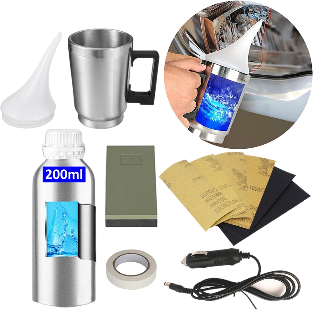 • Connect the cup to the power supply and wait for approximately three minutes until steam appears. Hold the cup’s handle with your right hand and evenly and slowly move the cup’s outlet about 1cm away from the headlight’s surface. The steam action will make the headlight surface shine. If there are deeper scratches, allow the steam to act in that area for a bit longer.