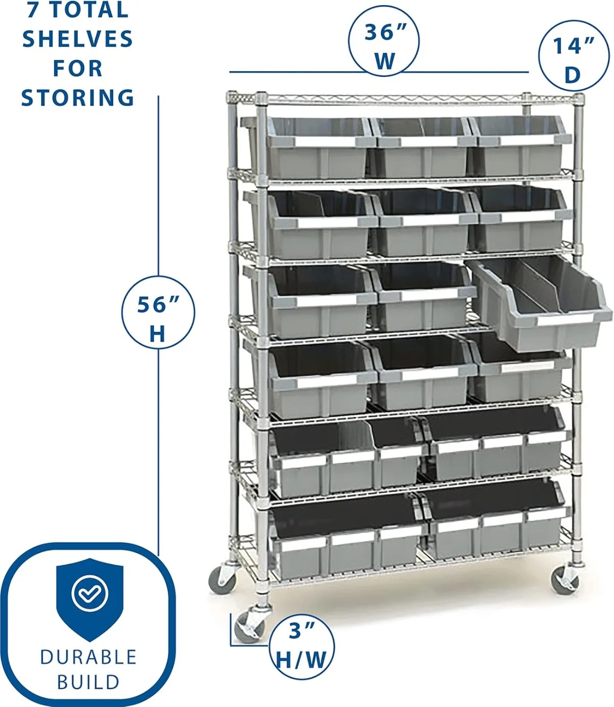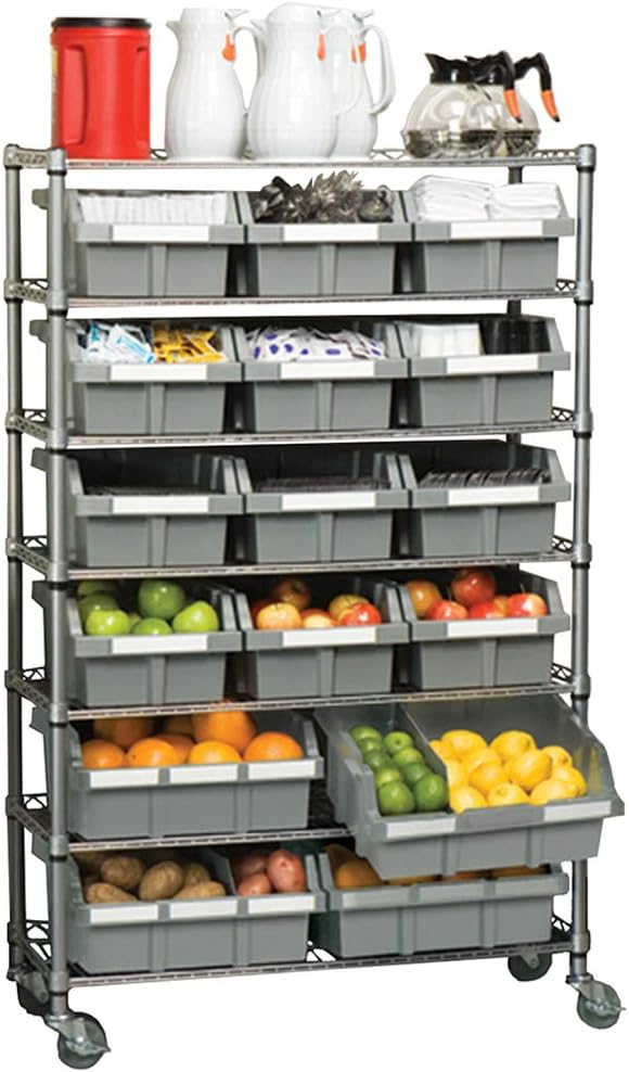 - 16 BINS on 7 TIERS – Shelving rack features durable solid steel wire construction finished in a gray epoxy powder coating. Includes removable high-impact polypropylene (HIPP) bins: 4 XL (16″ W x 14″ D x 7″ H), 12 large (10.5″ W x 14″ D x 7″ H), and 30 bin labels to help store and organize items.