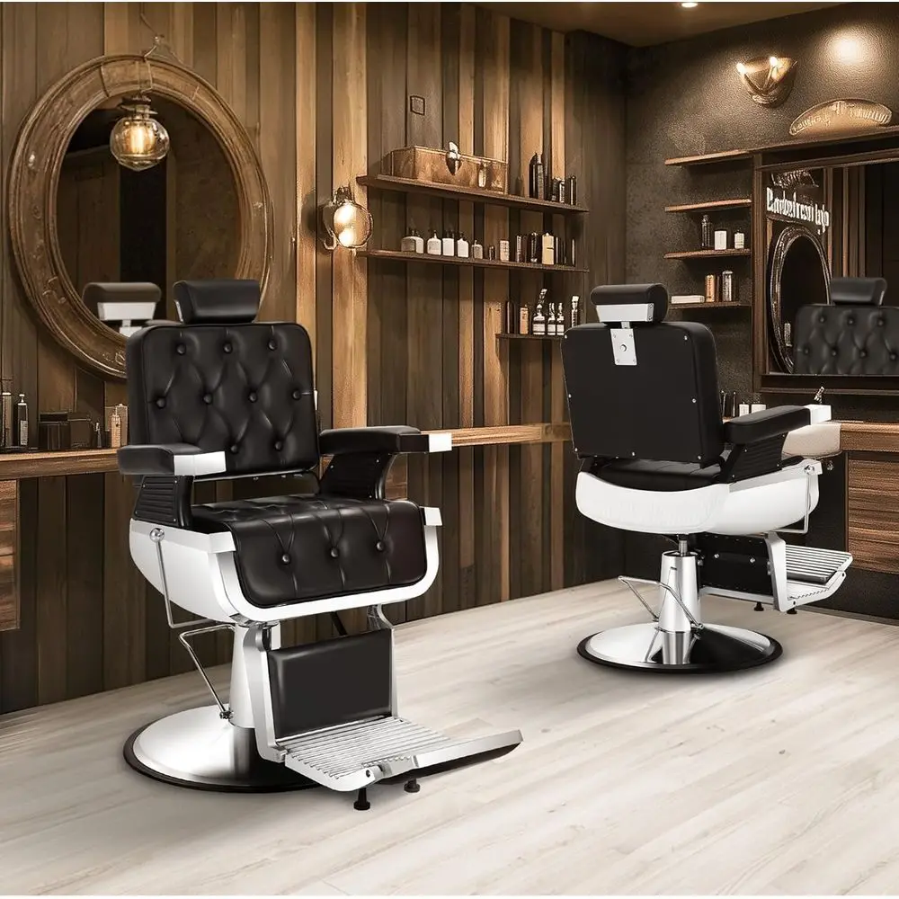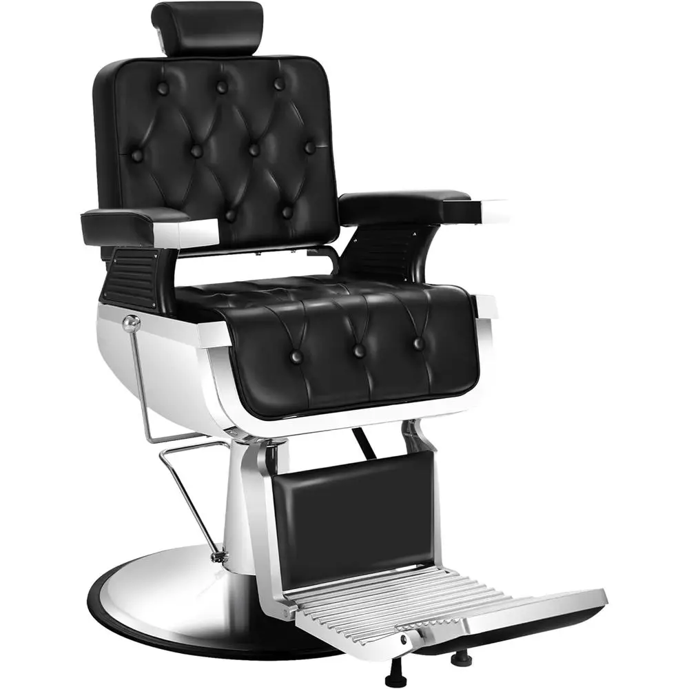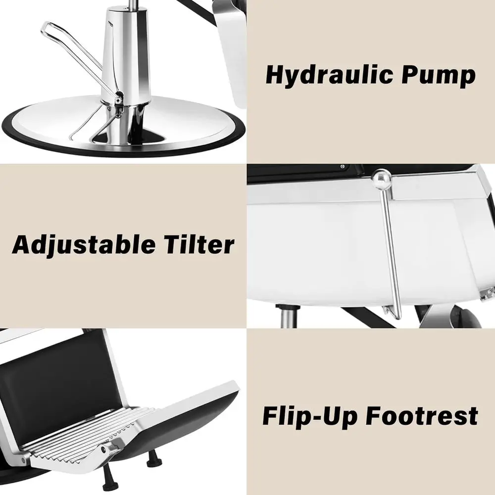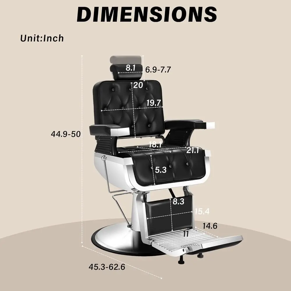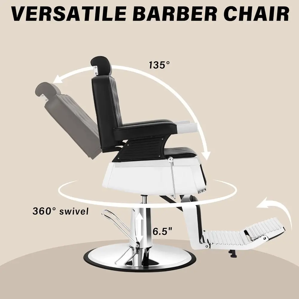 Fully Functional: The reclining barber chair can rotate 360 degrees, and the backrest can be adjusted from 90° to 135°. The seat can be adjusted from 6.9 to 7.8 inches, and the footrest is reversible and adjustable.