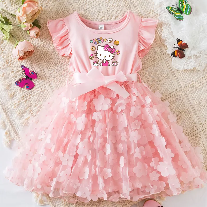 Hello Kitty Girls Summer Dress Cartoon Bow Tutu Dress 3D Butterfly Cute Cotton Party Casual Dress for Baby 2-6 Years