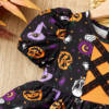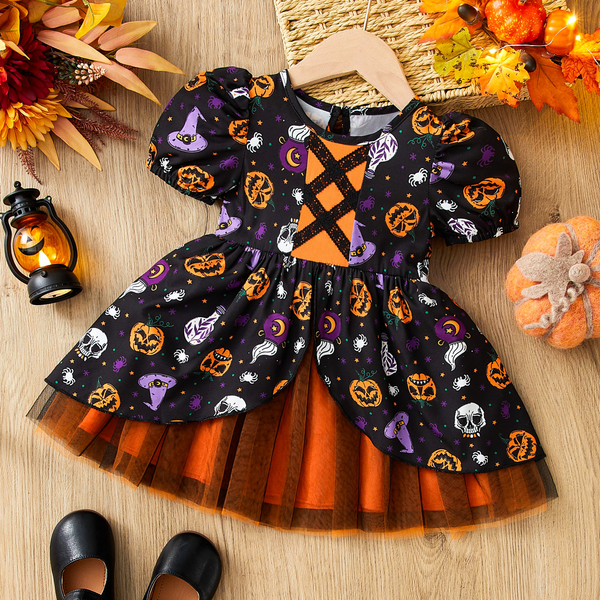 hibobi 1pcs Baby Girl Mesh Short Sleeve Dress, Puffed Sleeve Skirt, Patchwork Design, Suitable For Halloween Party Wear