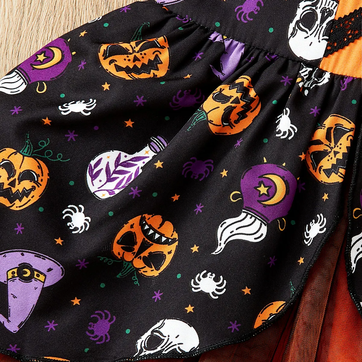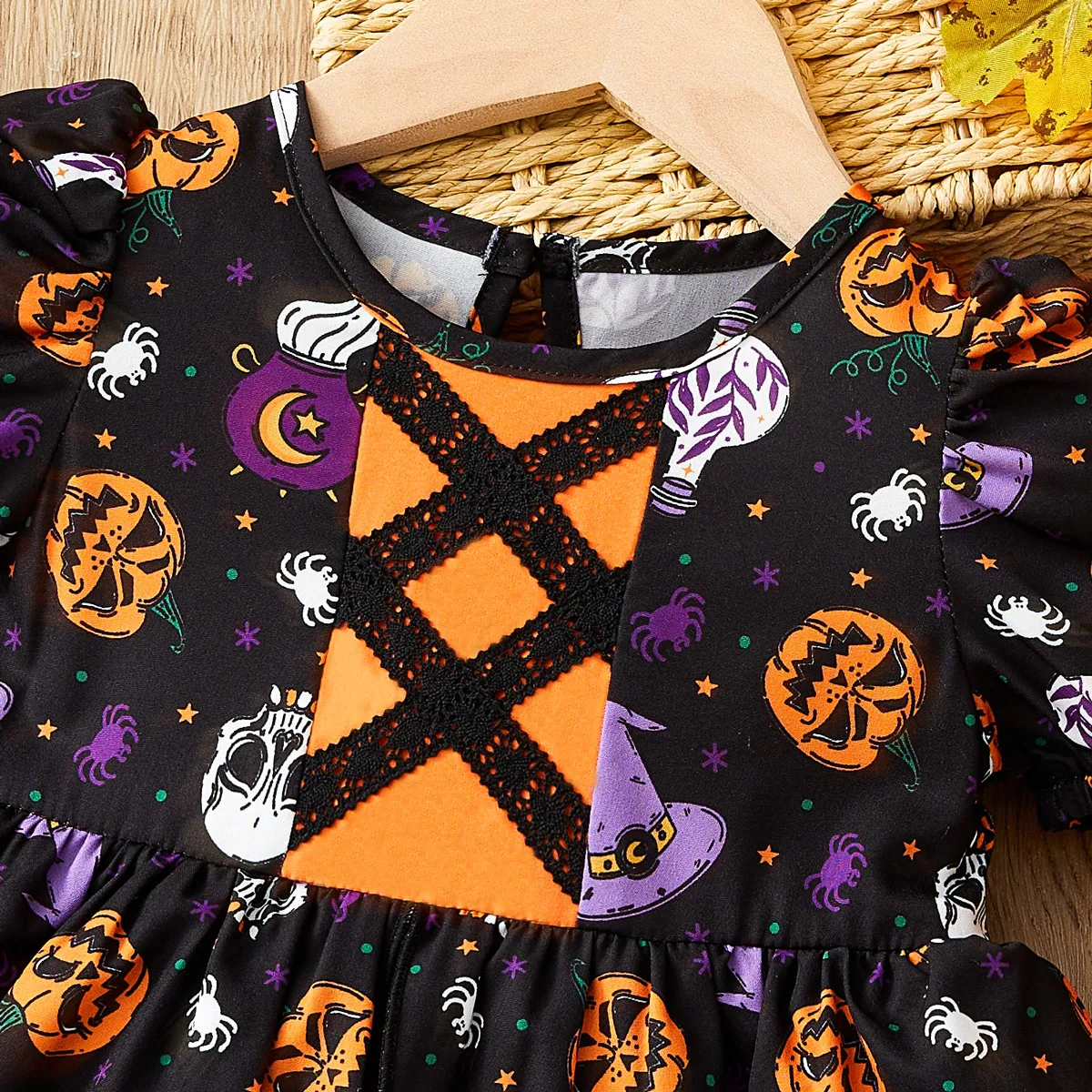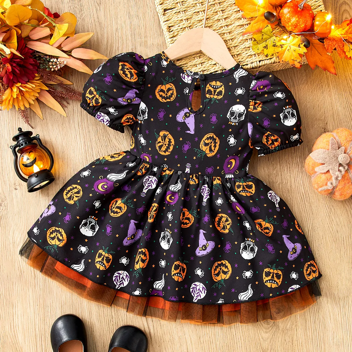 hibobi 1pcs Baby Girl Mesh Short Sleeve Dress, Puffed Sleeve Skirt, Patchwork Design, Suitable For Halloween Party Wear
