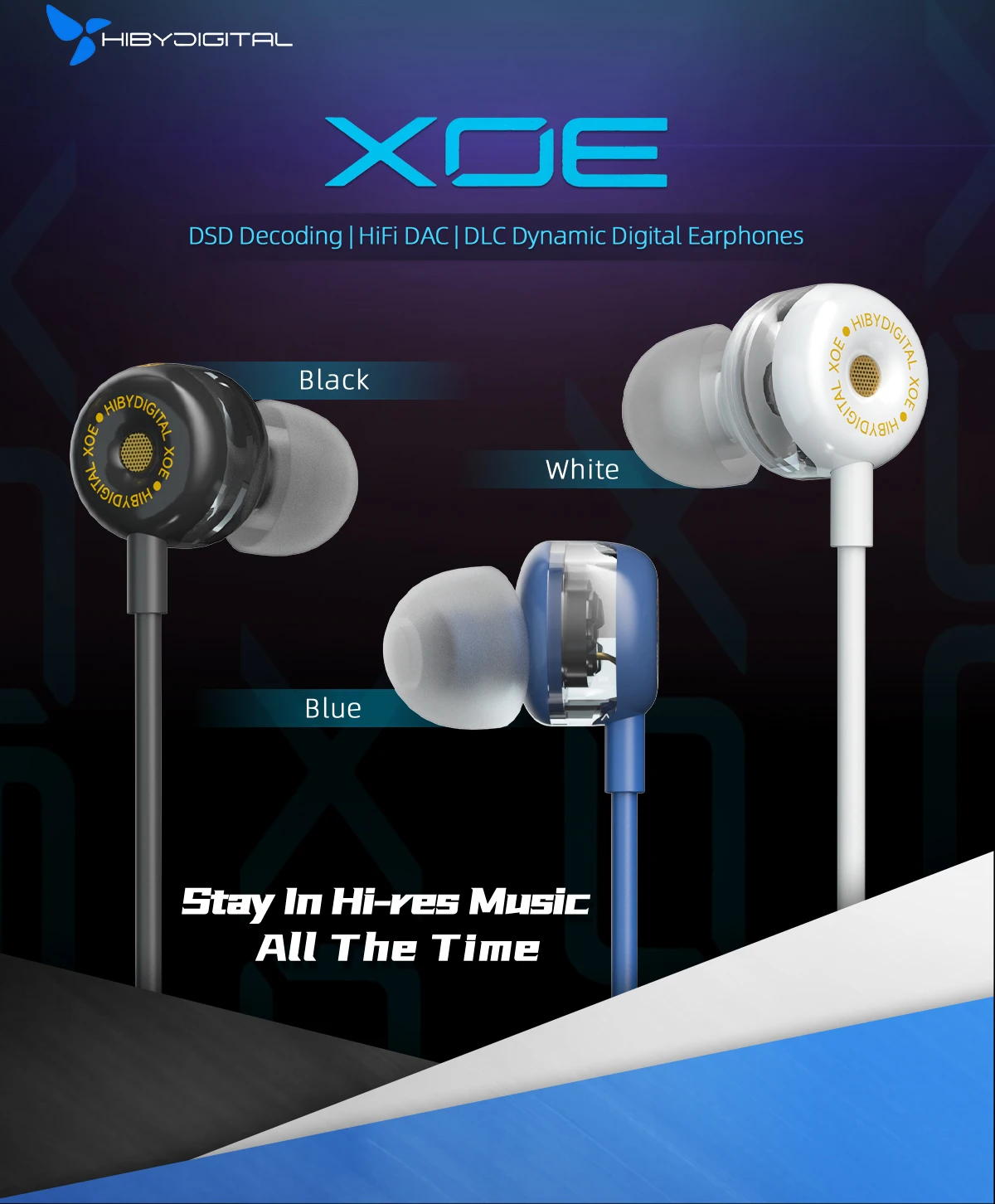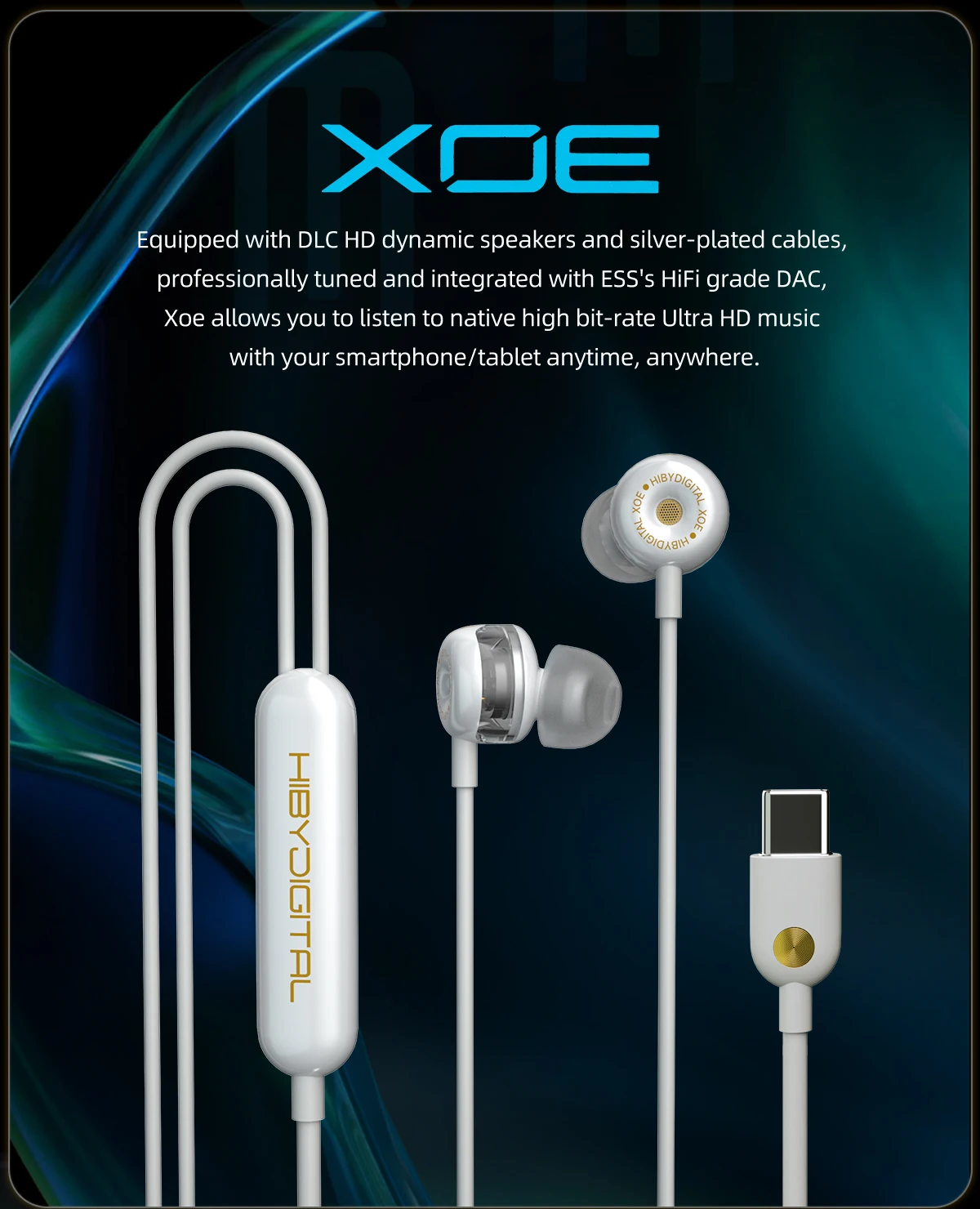 Xoe is HIBYDIGITAL’s first DLC dynamic audiophile earphones with native digital interface and DSD hardware decoding.Equipped with DLC (Diamond Like Carbon) diaphragm HD dynamic speakers and silver-plated audiophile cables, professionally tuned and integrated with ESS’s HiFi grade DAC, Xoe allows you to listen to native high bit-rate Ultra HD music with your smartphone/tablet at any time. Meanwhile, Xoe’s the built-in high sensitivity mems microphone can support daily incoming calls and high-definition recordings without signal or external interference.