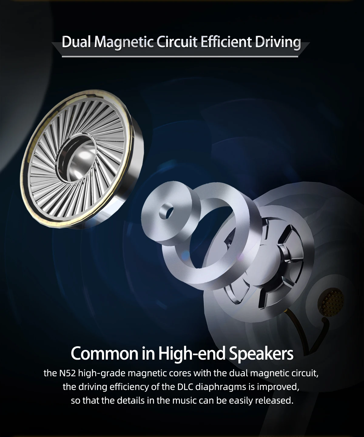 Dual Magnetic Circuit Efficient Driving: Using the N52 high-grade magnetic cores, which are common in high-end speakers, with the dual magnetic circuit architecture, the driving efficiency of the DLC diaphragms with sufficient rigidity is improved, so that the details in the music can be easily released.
