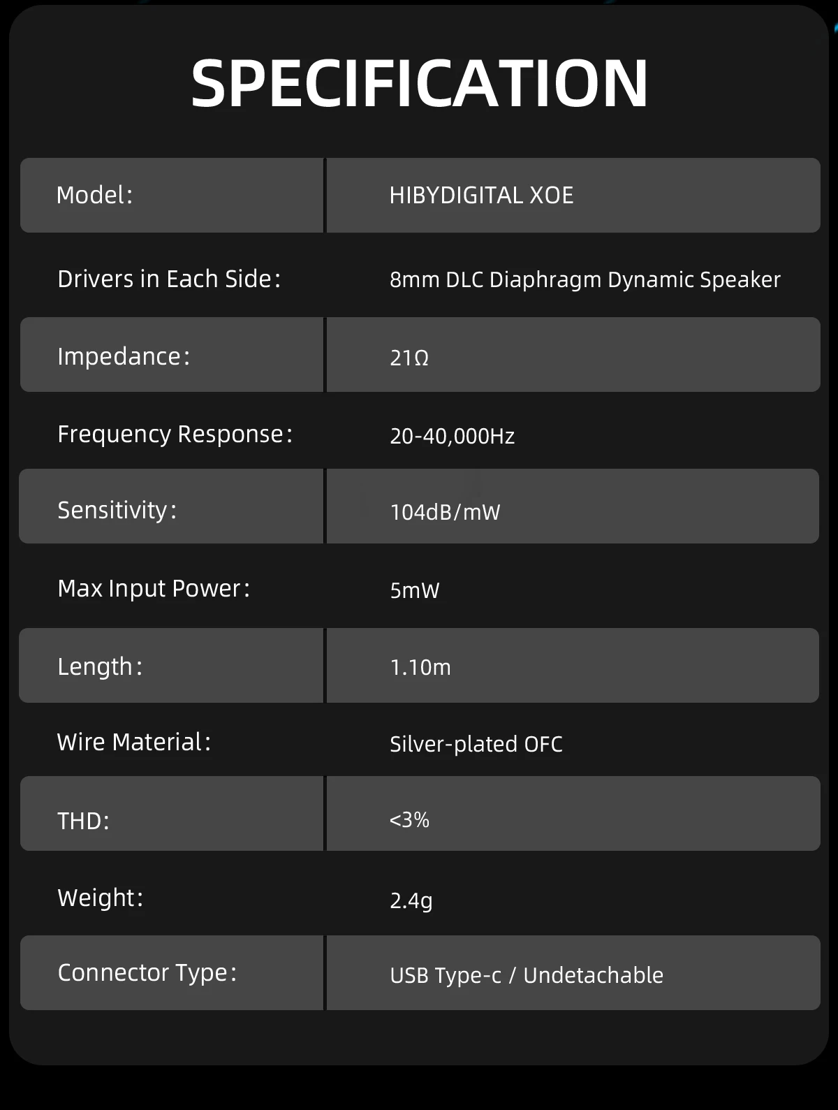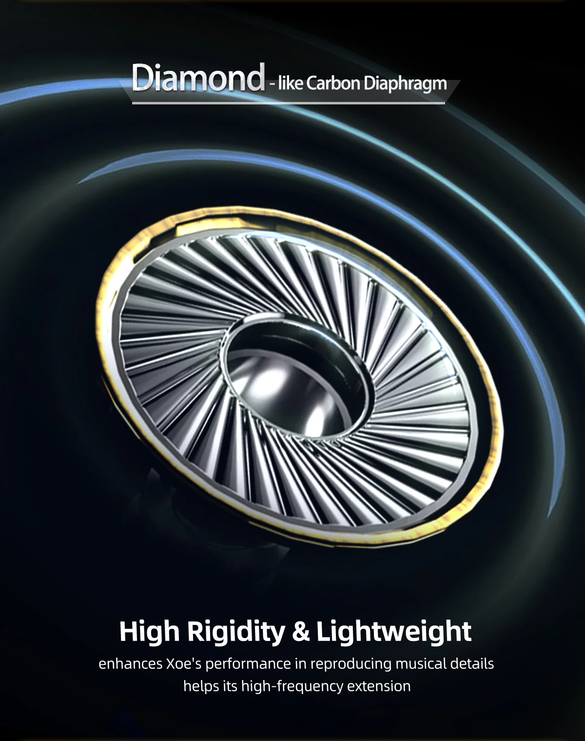 DLC (Diamond Like Carbon) diaphragm: The Diamond-like Carbon diaphragm with high rigidity enhances the HIBYDIGITAL Xoe’s performance in reproducing musical details, and its lightweight also helps its high-frequency extension.