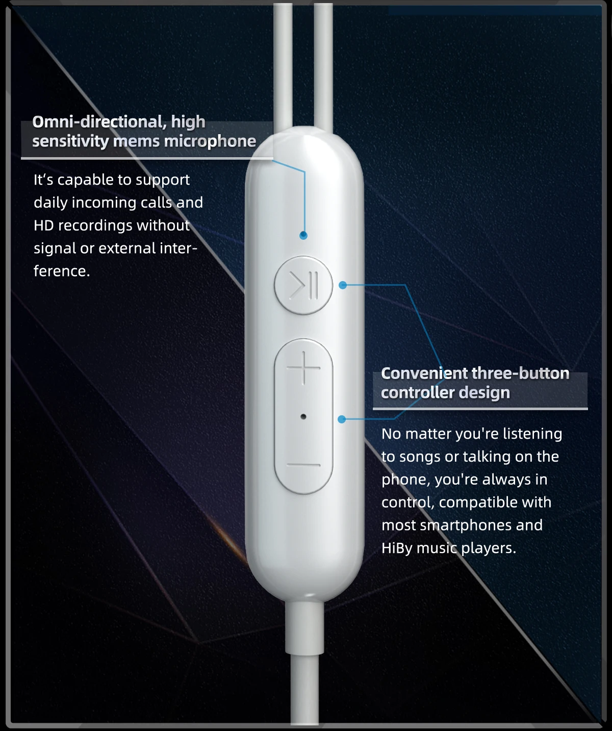 Convenient three-button controller design: No matter you’re listening to songs or talking on the phone, you’re always in control, compatible with most smartphones and HiBy music players.