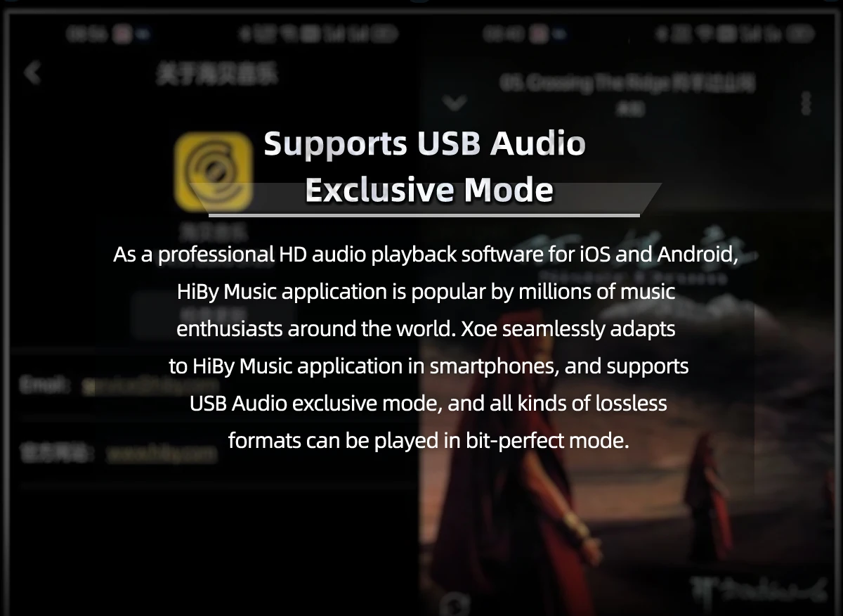 Supports USB Audio Exclusive Mode: As a professional HD audio playback software for iOS and Android systems, HiBy Music application is popular by millions of music enthusiasts around the world. HIBYDIGITAL Xoe seamlessly adapts to HiBy Music application in smartphones, and supports USB Audio exclusive mode, and all kinds of lossless formats can be played in bit-perfect mode.