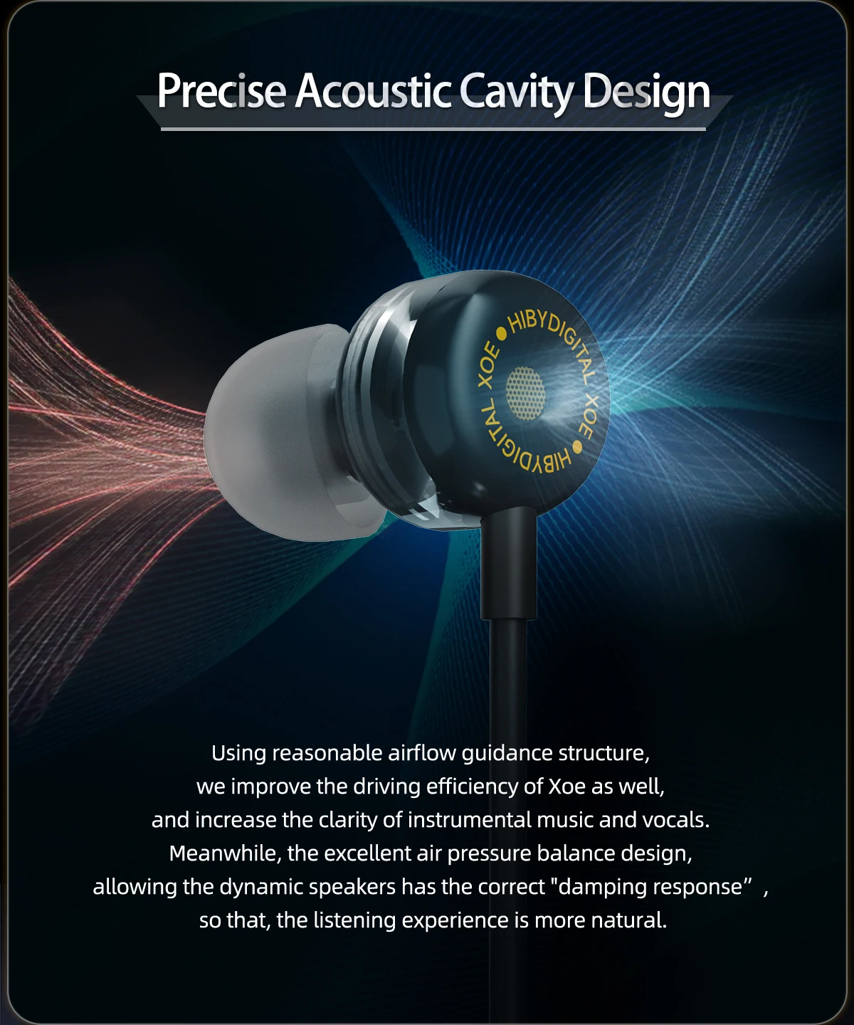 Precise acoustic cavity design: Using reasonable airflow guidance structure, we improve the driving efficiency of the HIBYDIGITAL Xoe as well, and increase the clarity of instrumental music and vocals. Meanwhile, the excellent air pressure balance design, allowing the dynamic speakers has the correct “damping response”, so that, the listening experience is more natural.