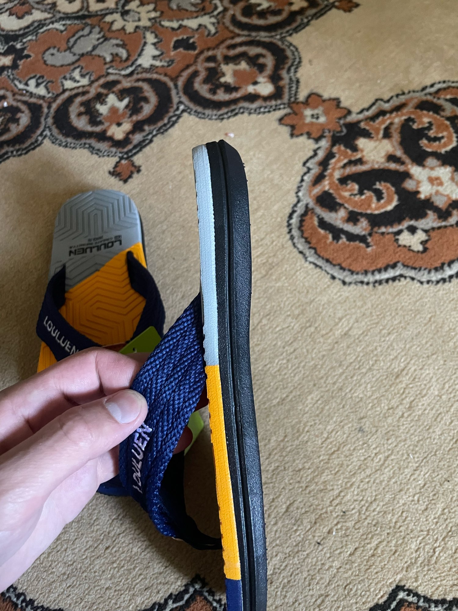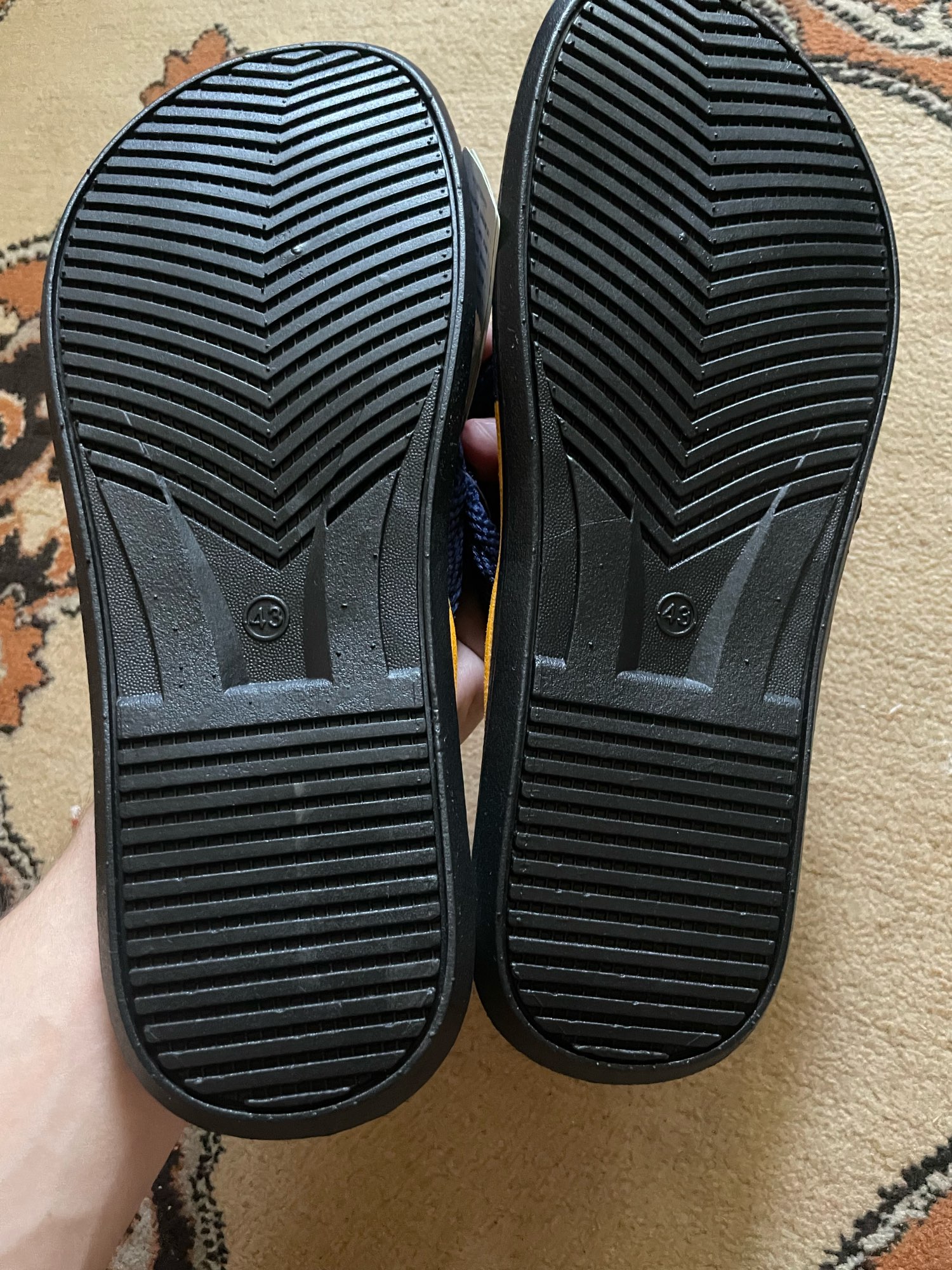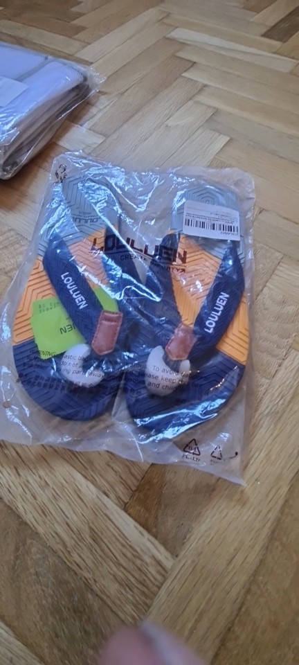 Looks just like the adds. Soft fabric between the toes and comfortable texture on the sole. Sizing is true to show size so maybe go up a size or two for a little more room around the edges.