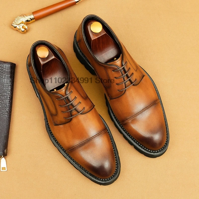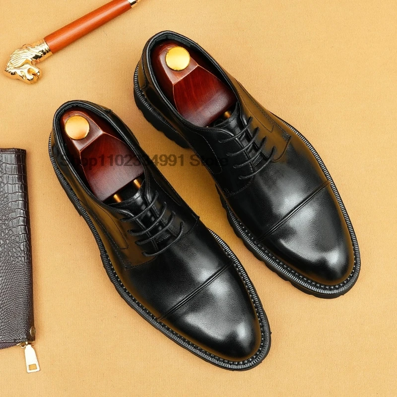 HNXC Classic Lace-Up Mens Oxfords Genuine Leather Office Luxury Shoes Solid Cap Toe Wedding Party Formal Dress Shoes Black Brown