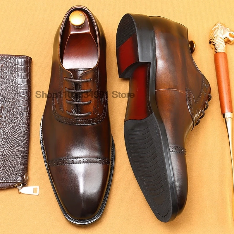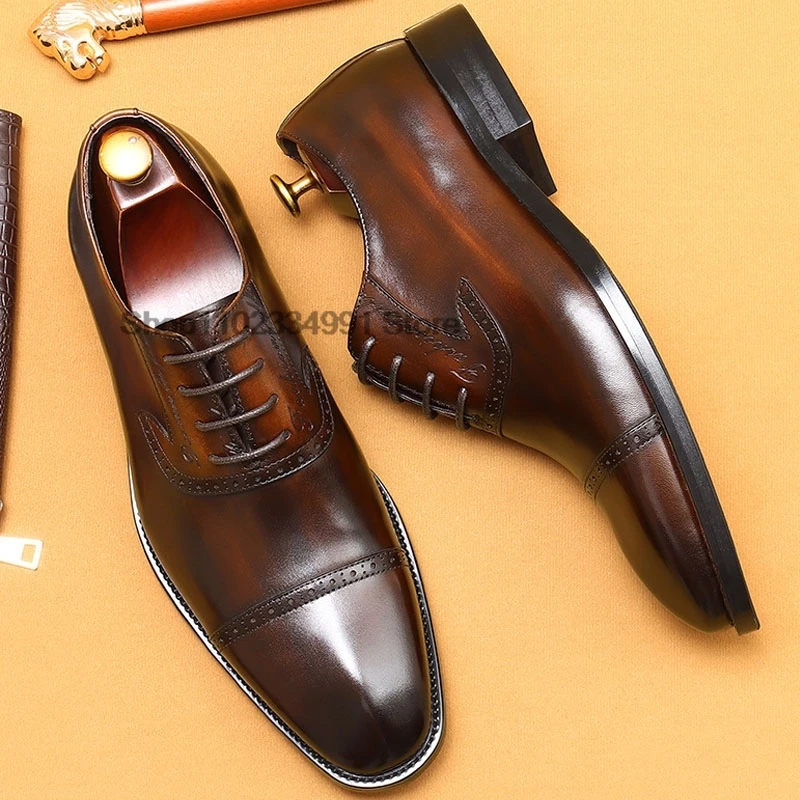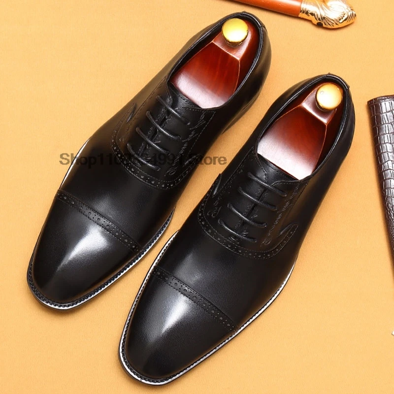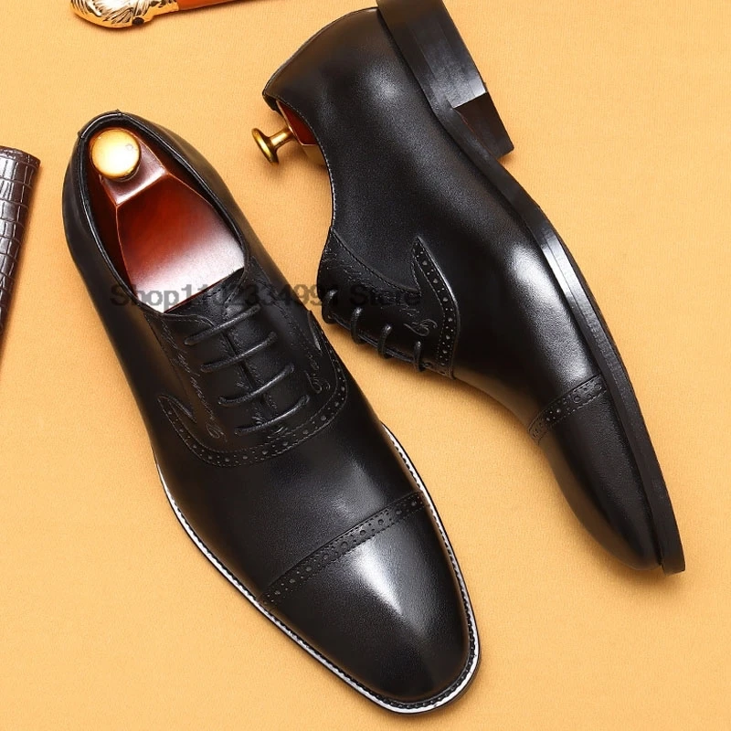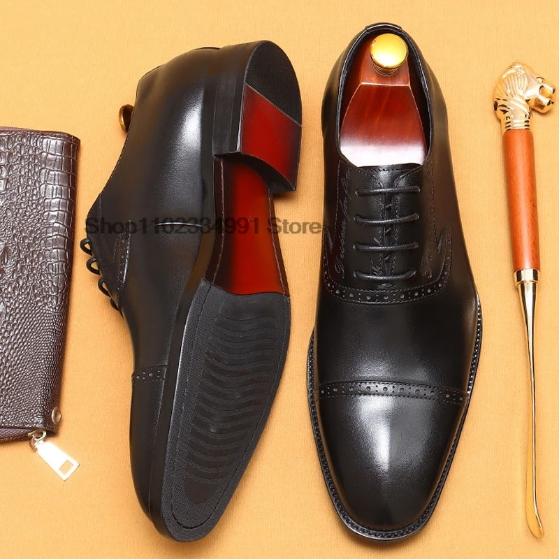 HNXC Classic Mens Oxford Shoes Handmade Genuine Leather Calfskin Brogue Shoes Wedding Party Cap Toe Formal Shoes Black And Brown