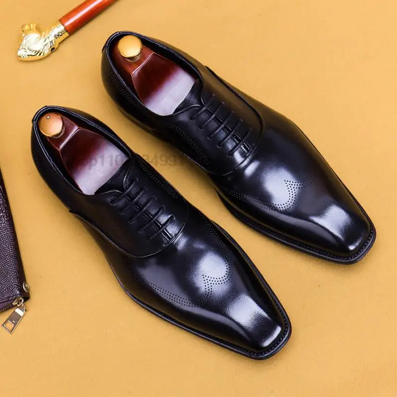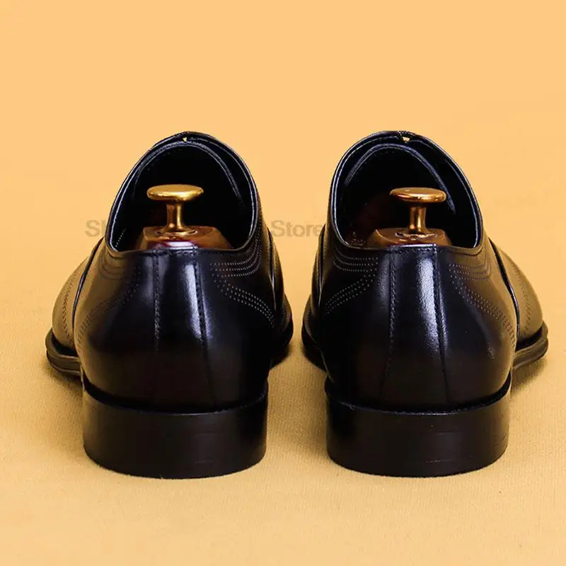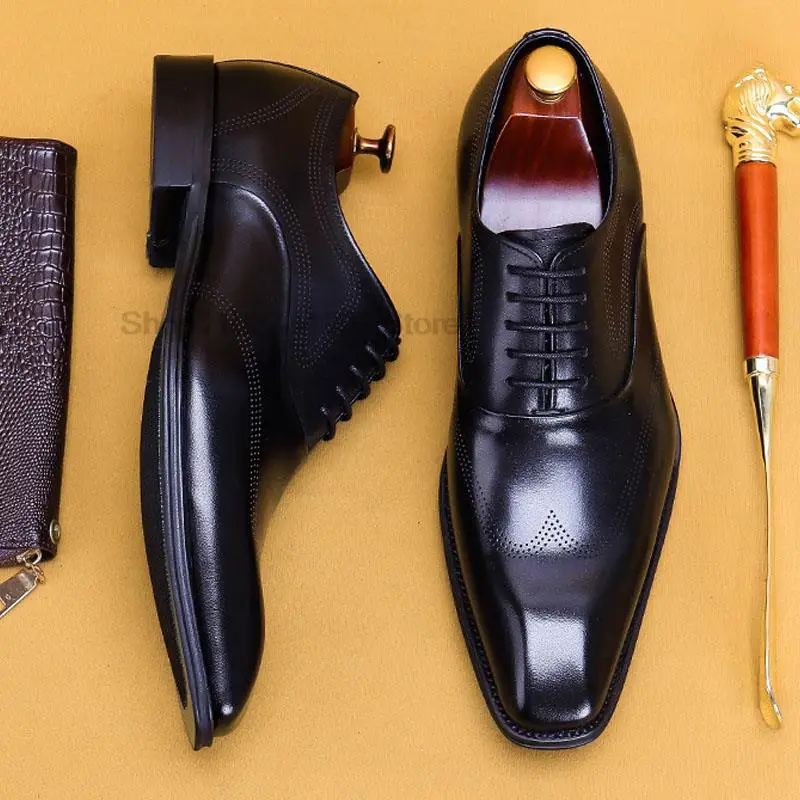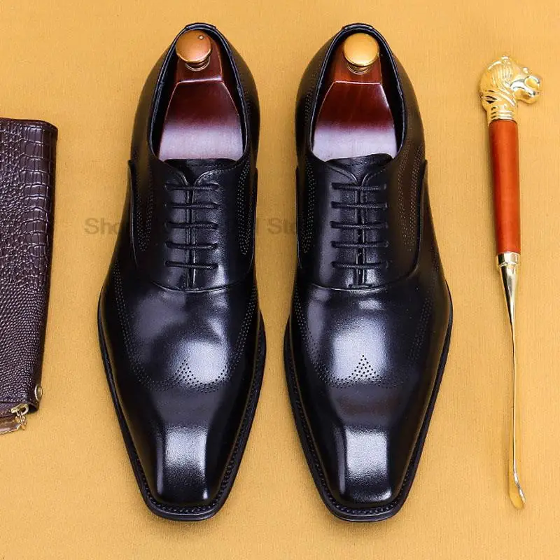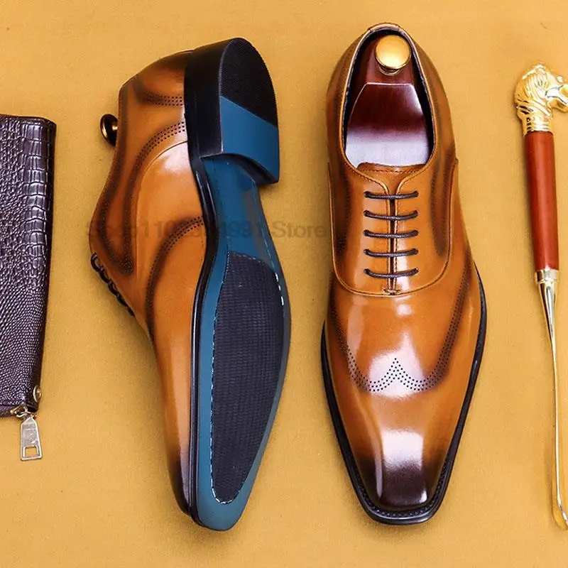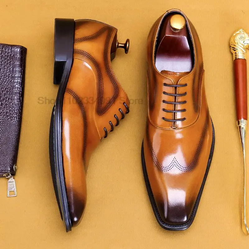HNXC Men Wedding Dress Brogue Genuine Leather Lace-up Latest Design Fashion Color Match Handmade Leather Man Pointed Dress Shoes