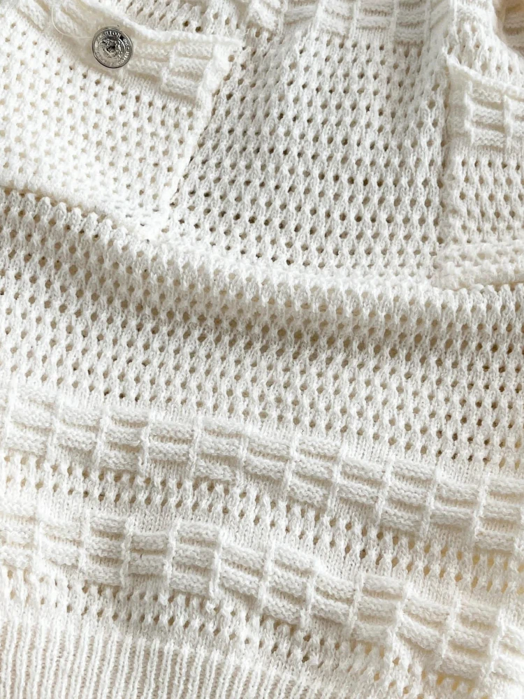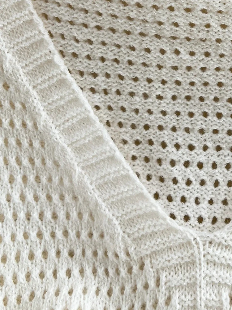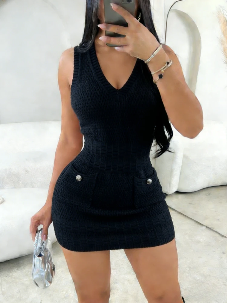 Hollow Out Knit Mini Dress Women’s Sleeveless V-Neck Bodycon Short Dress Button Decor Summer Beach Vacation Sexy Dress