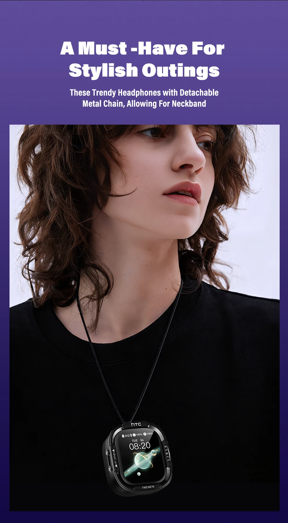 Cyberpunk-style charging case + metallic texture body, paired with a smart touch color screen, supports custom watch faces and backgrounds, making it both an earphone case and a “portable tech gadget.”
