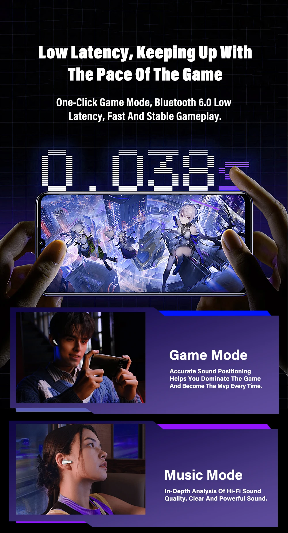Bluetooth 6.0 technology, supports one-click activation of game mode, lower latency, more stable connection, smooth audio and video synchronization, a boon for mobile gamers.