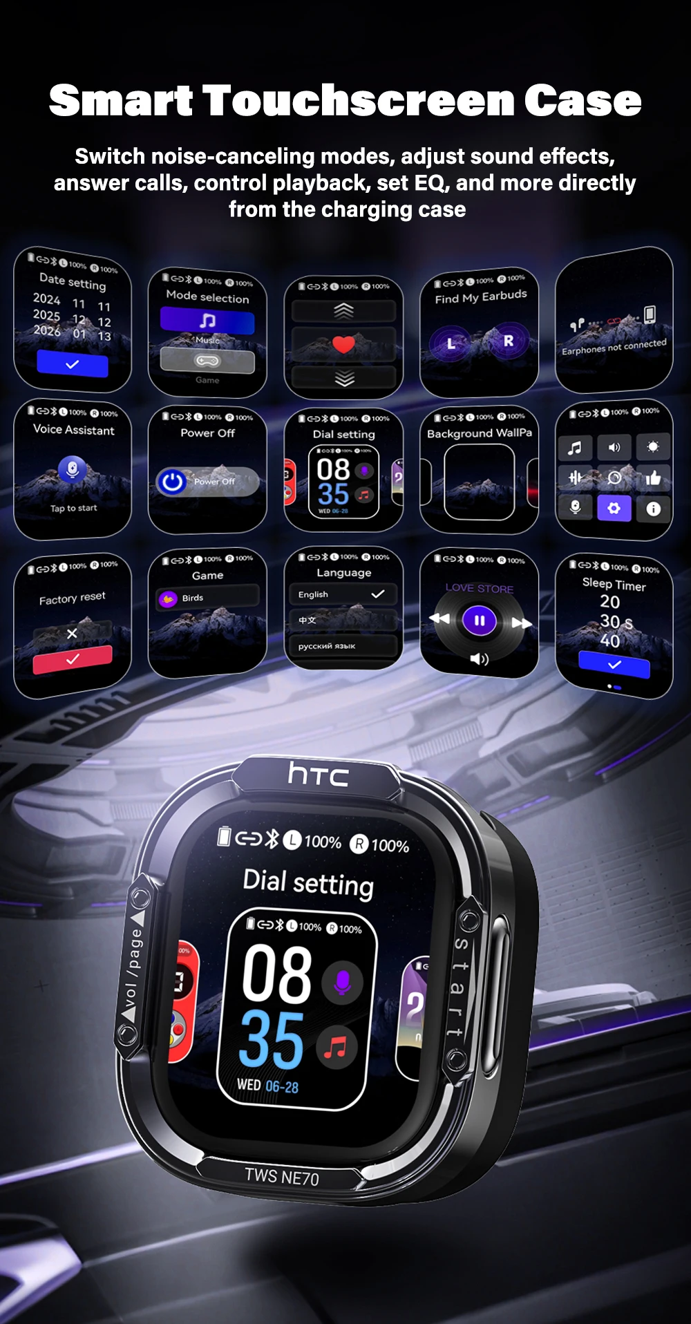 The charging case has a built-in touch screen, allowing you to directly: