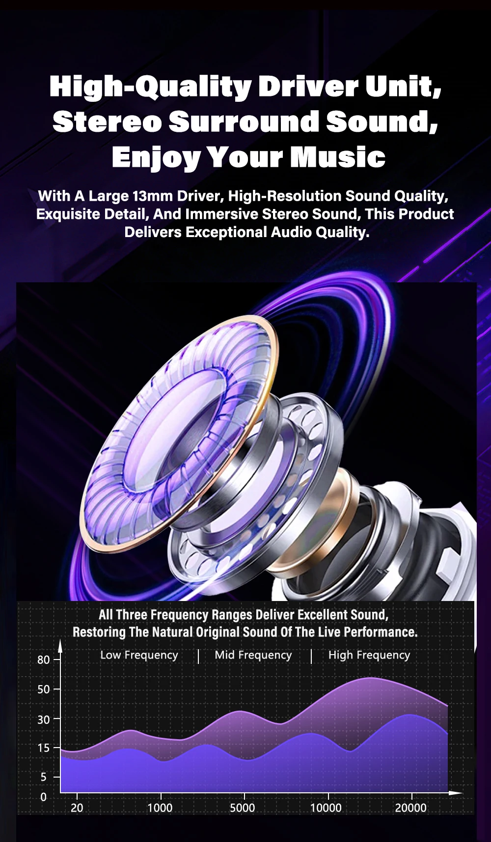13mm large dynamic driver: Powerful and shocking bass, delicate and clear treble, fully immersive experience