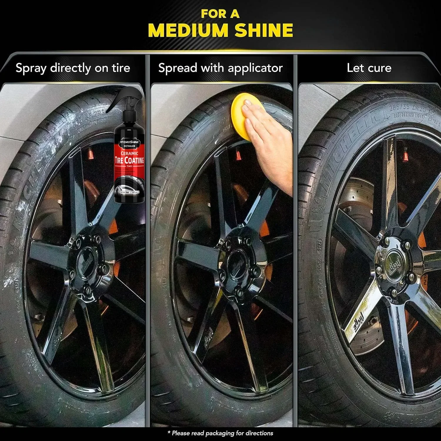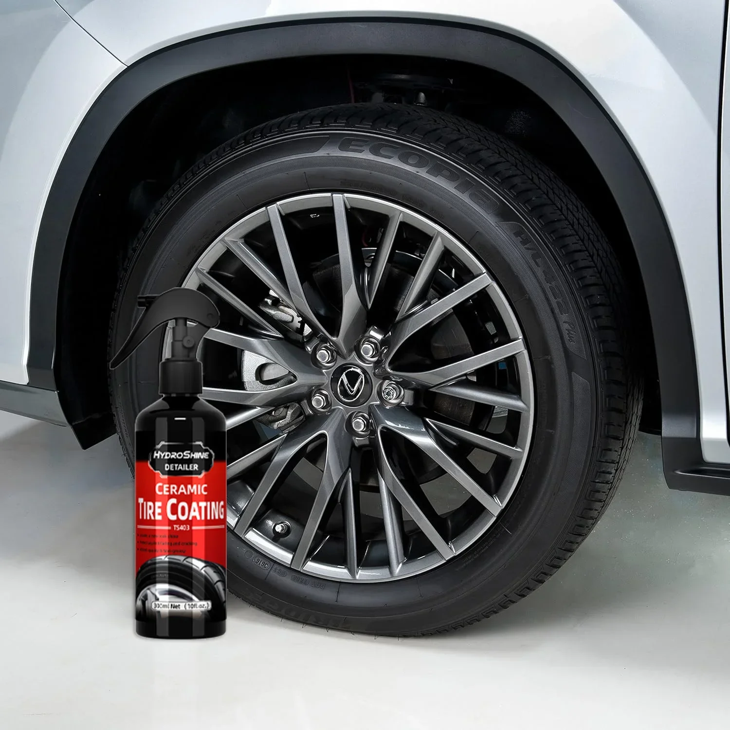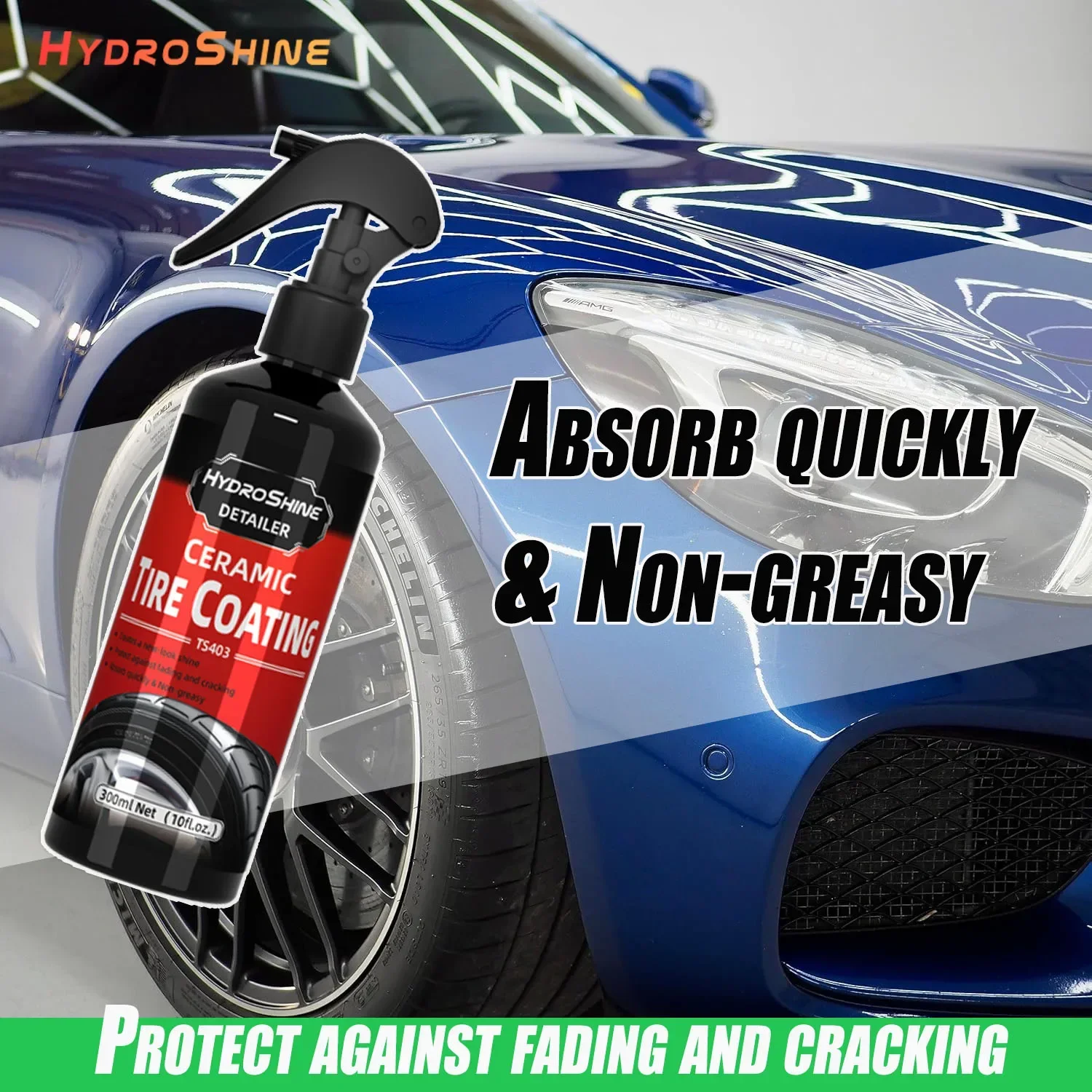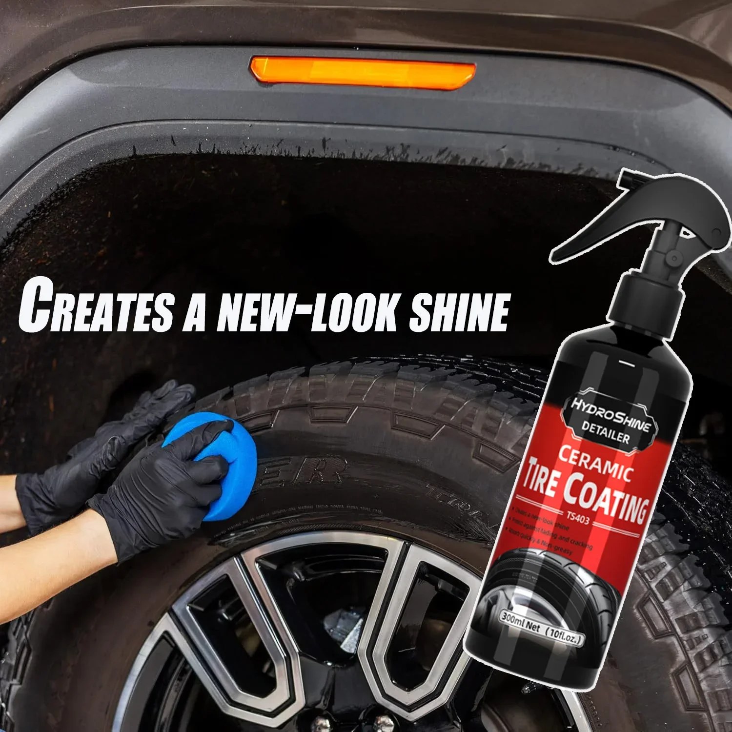 Hydroshine Ceramic Tire Coating quickly restores its original fresh, wet black shine and protects it from dust, water and bad weather. The spray-able tyre coating agent is designed to penetrate