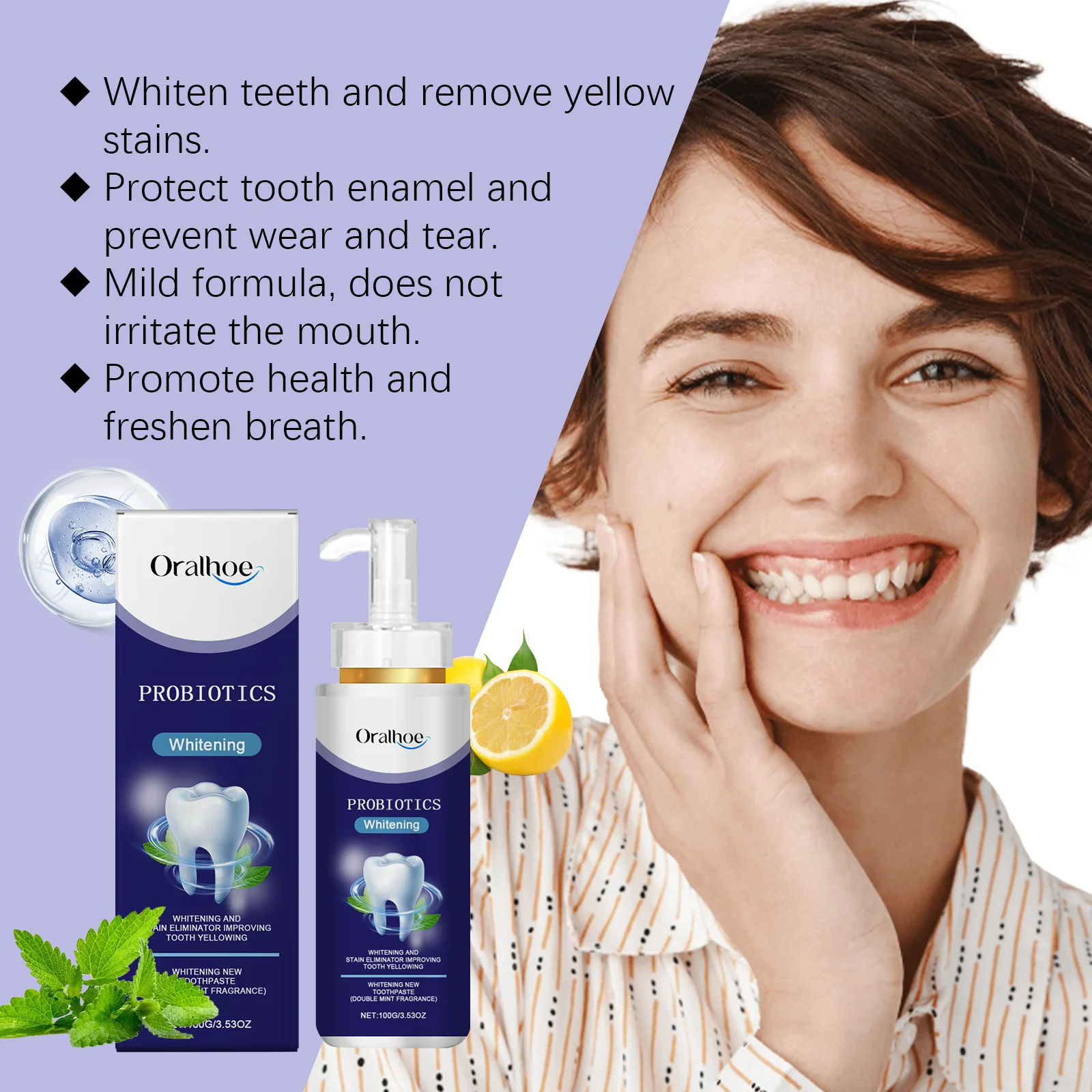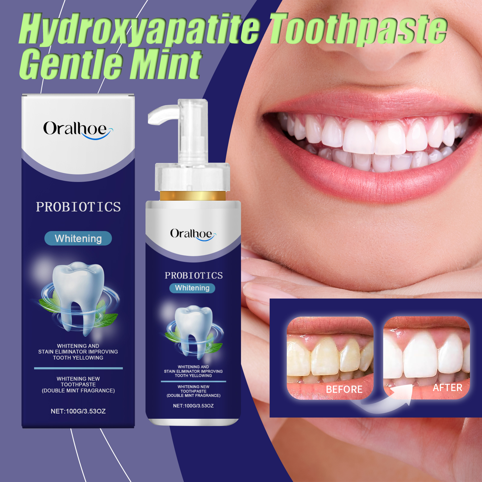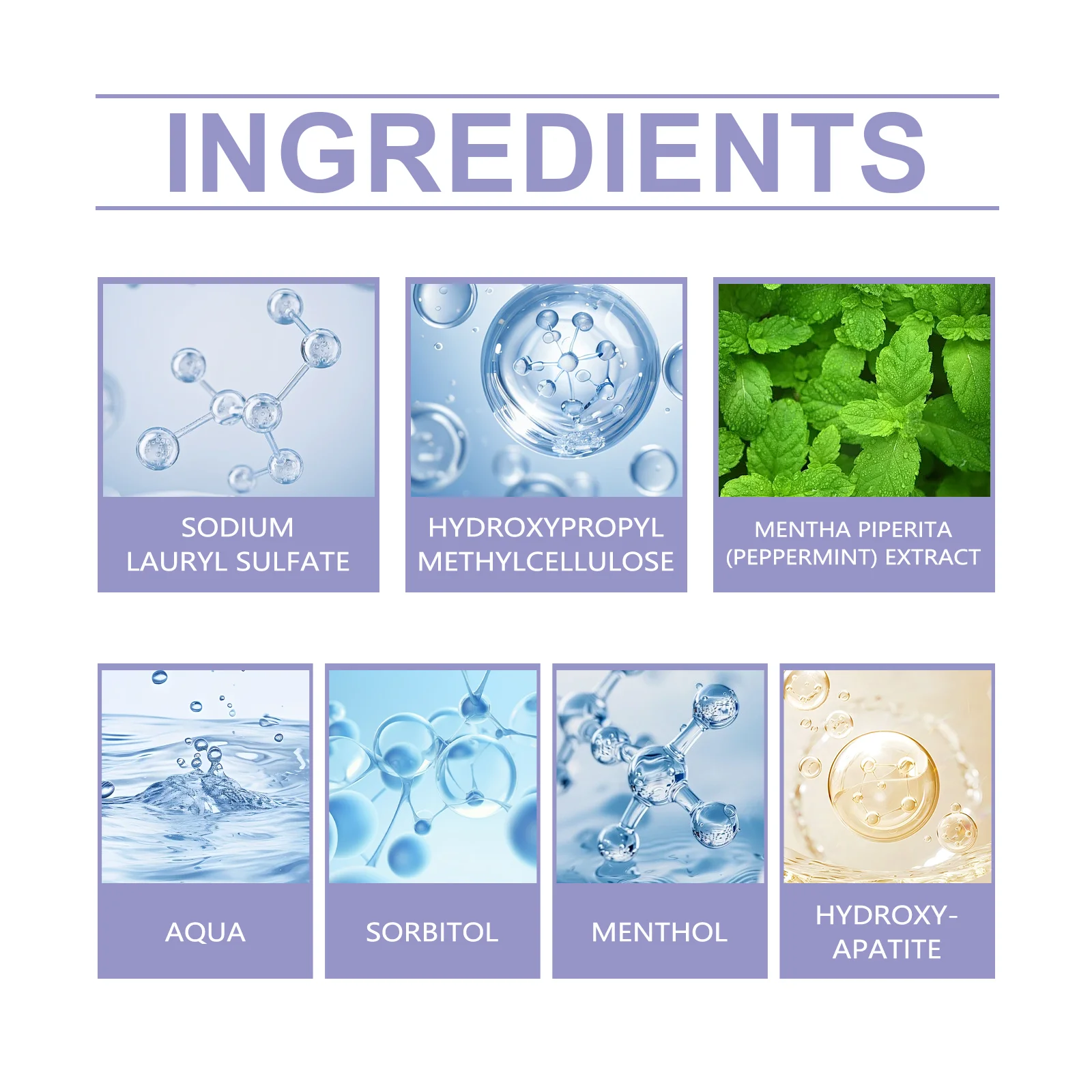 1. Our oral care toothpaste contains menthol, hydroxyapatite, and peppermint extract. It prevents acid erosion, protects tooth enamel, and strengthens tooth protection. It effectively removes yellow stains and stains on the tooth surface.